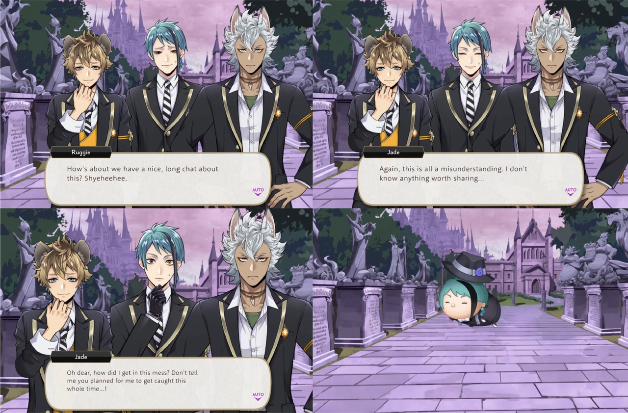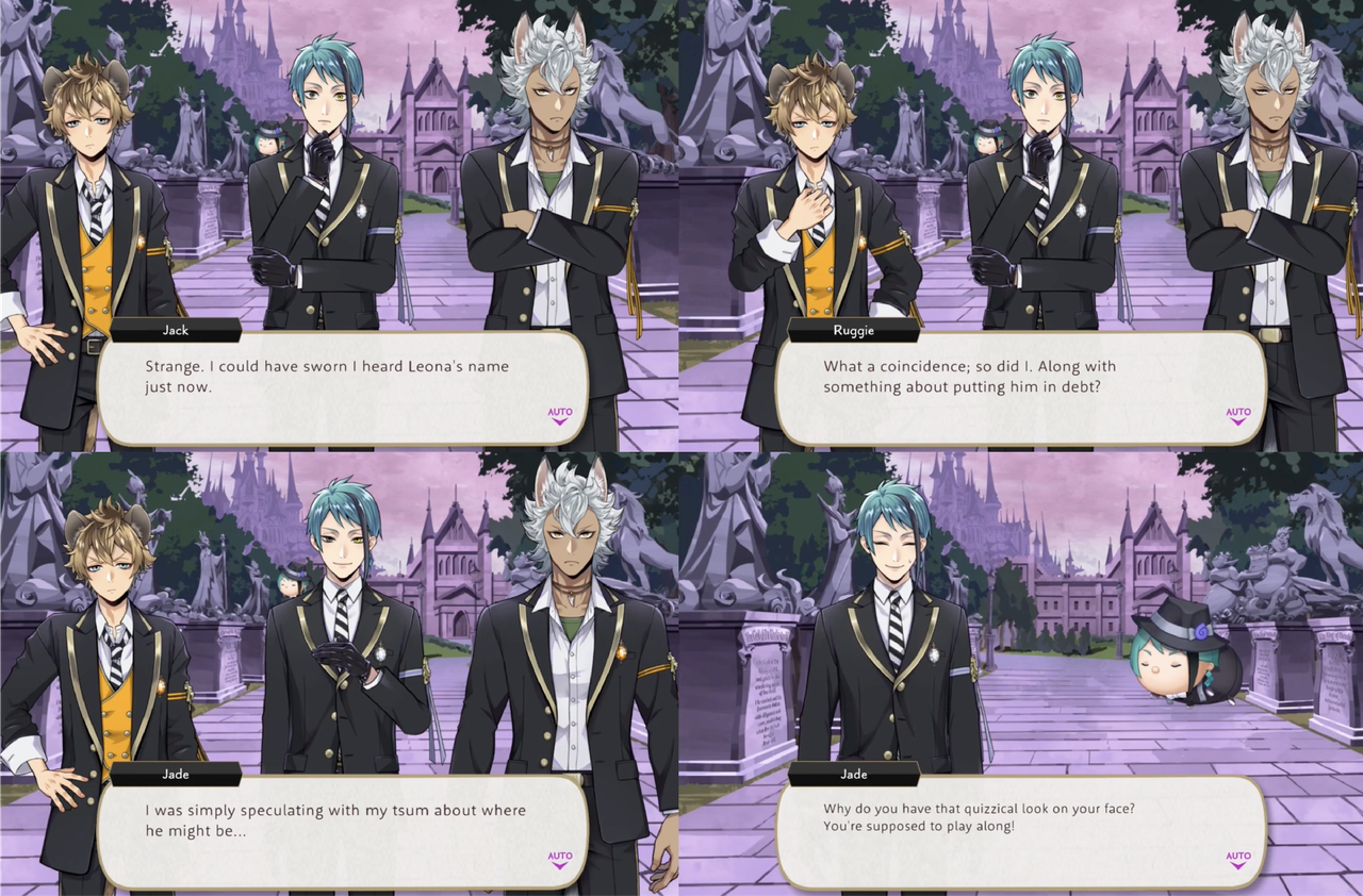 Jack and Ruggie both overhear Jade speaking to his tsum about putting Leona in his debt and escort him away for “a nice, long chat.”