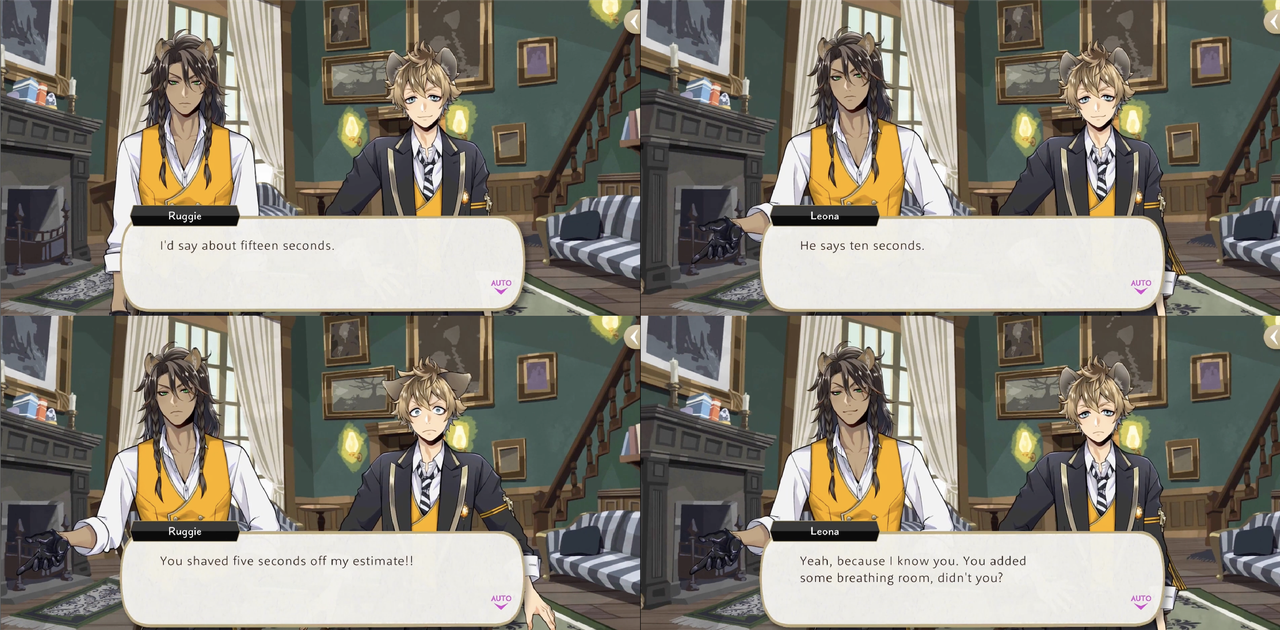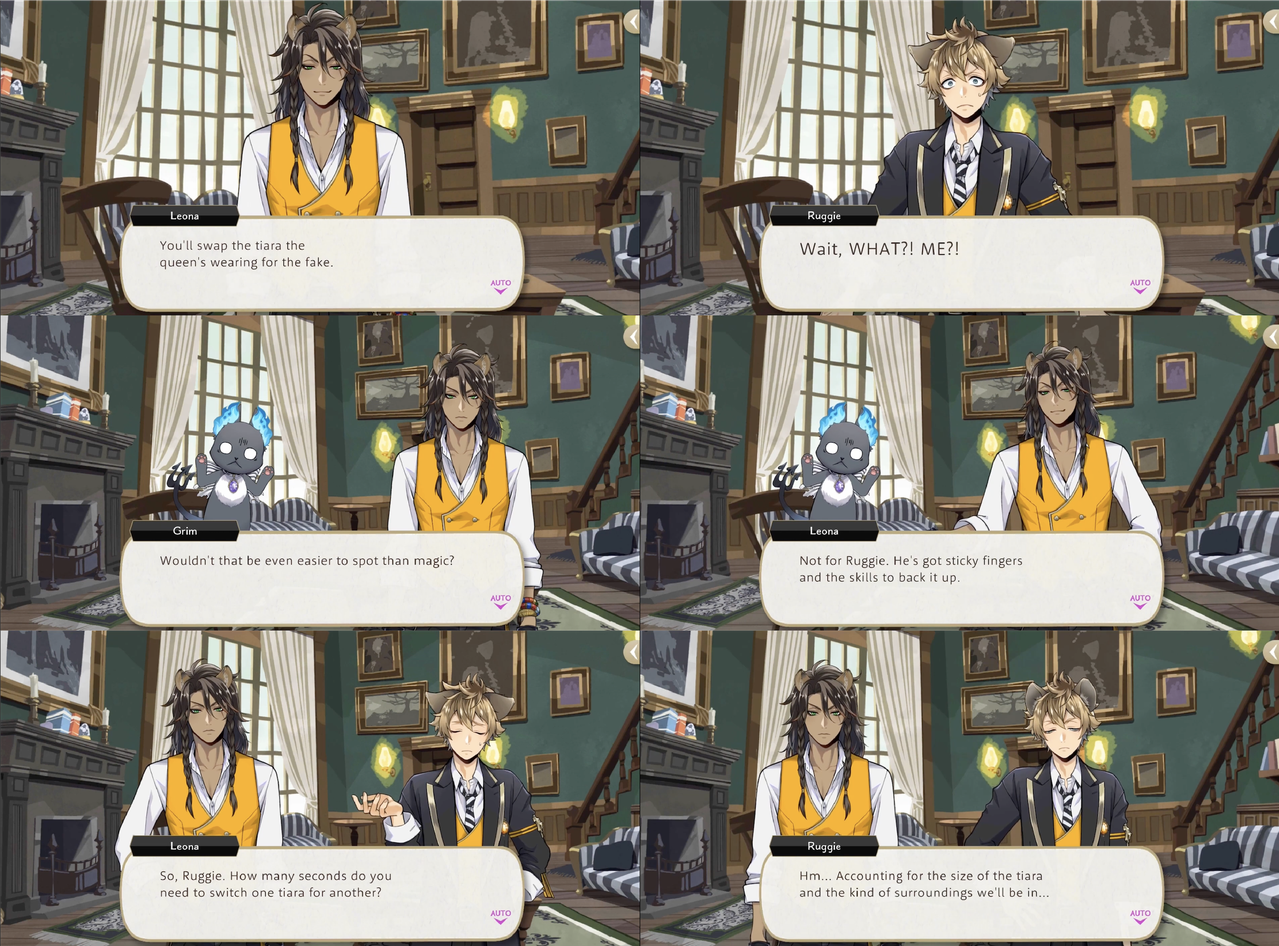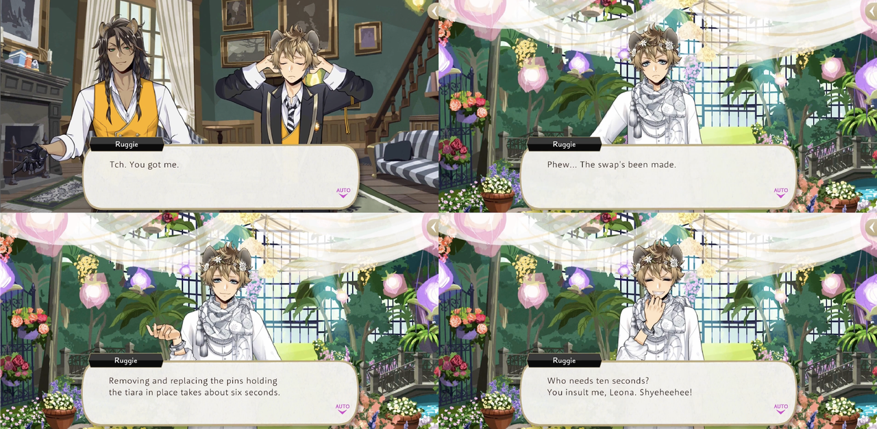 Ruggie says that he will need 15 seconds to swap a fake tiara for a real one that Leona cuts down to ten seconds, but on the day of the heist he successfully manages the trade within six seconds. (Ruggie: “Who needs ten seconds? You insult me, Leona. Shyeheehee!”)