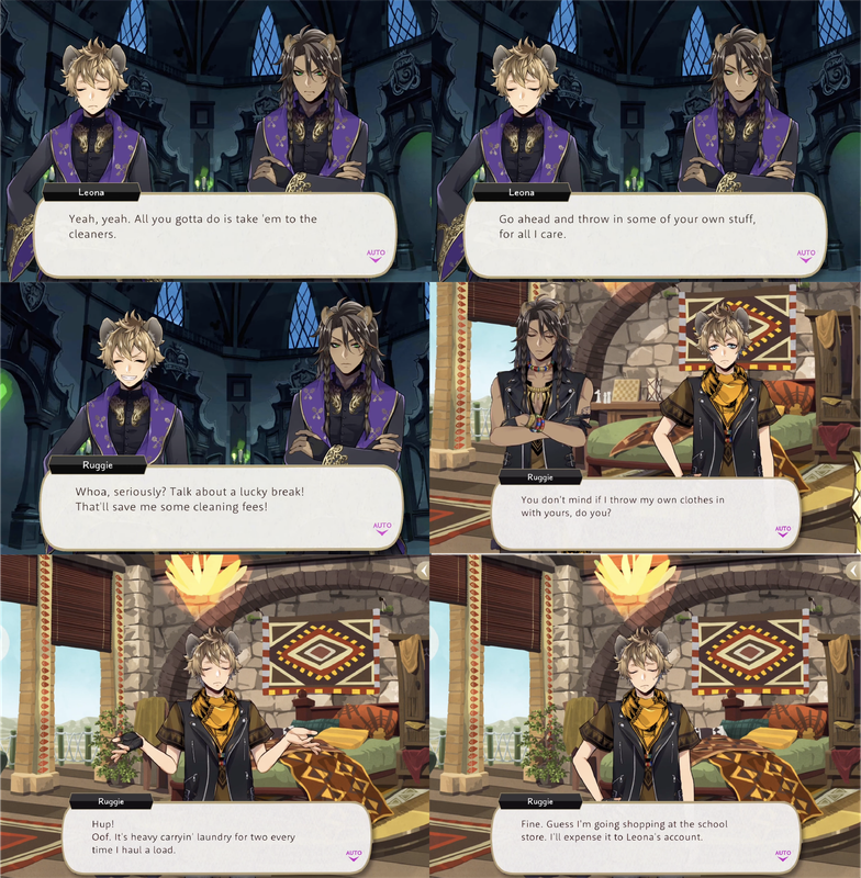 It seems that Ruggie is also in charge of cleaning Leona’s room, which is maybe the task we hear him complain about the most, with Leona paying for Ruggie’s laundry provided that he has their clothes cleaned together.