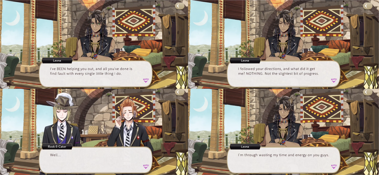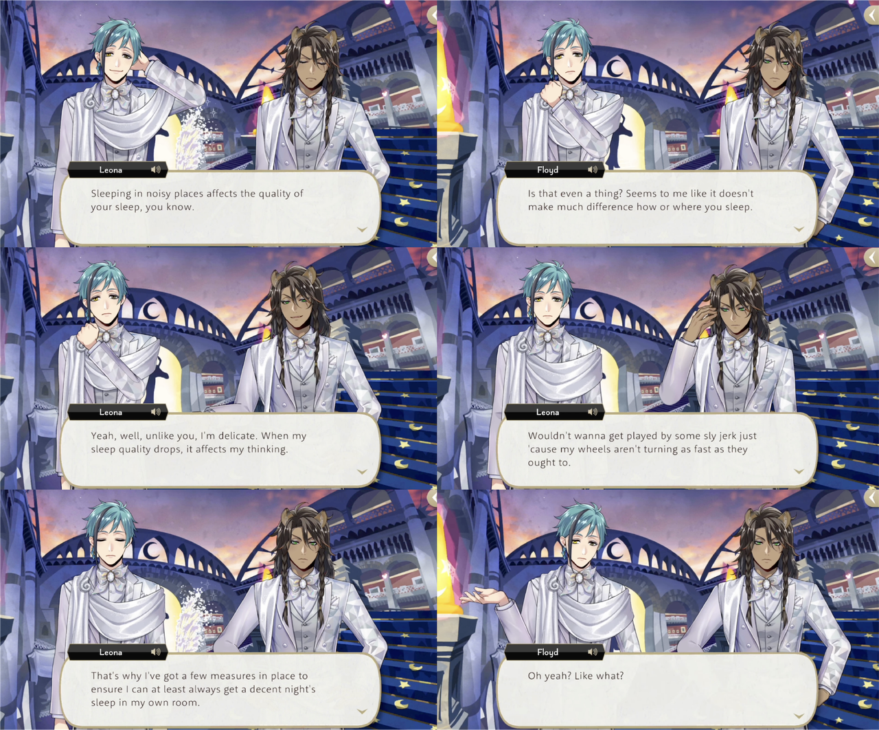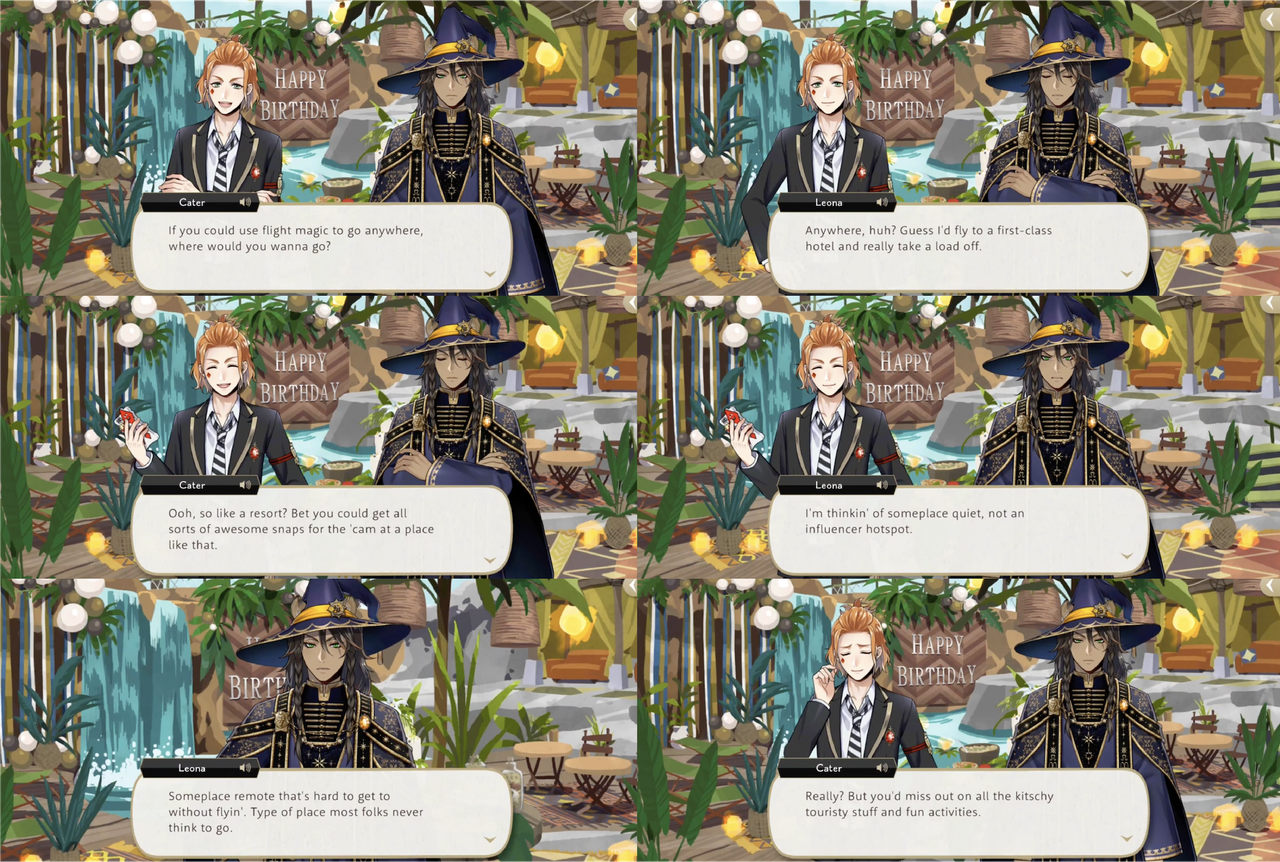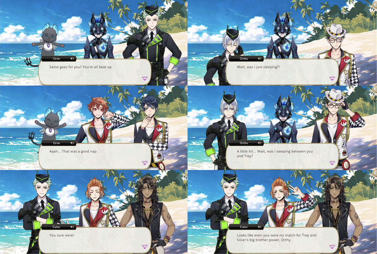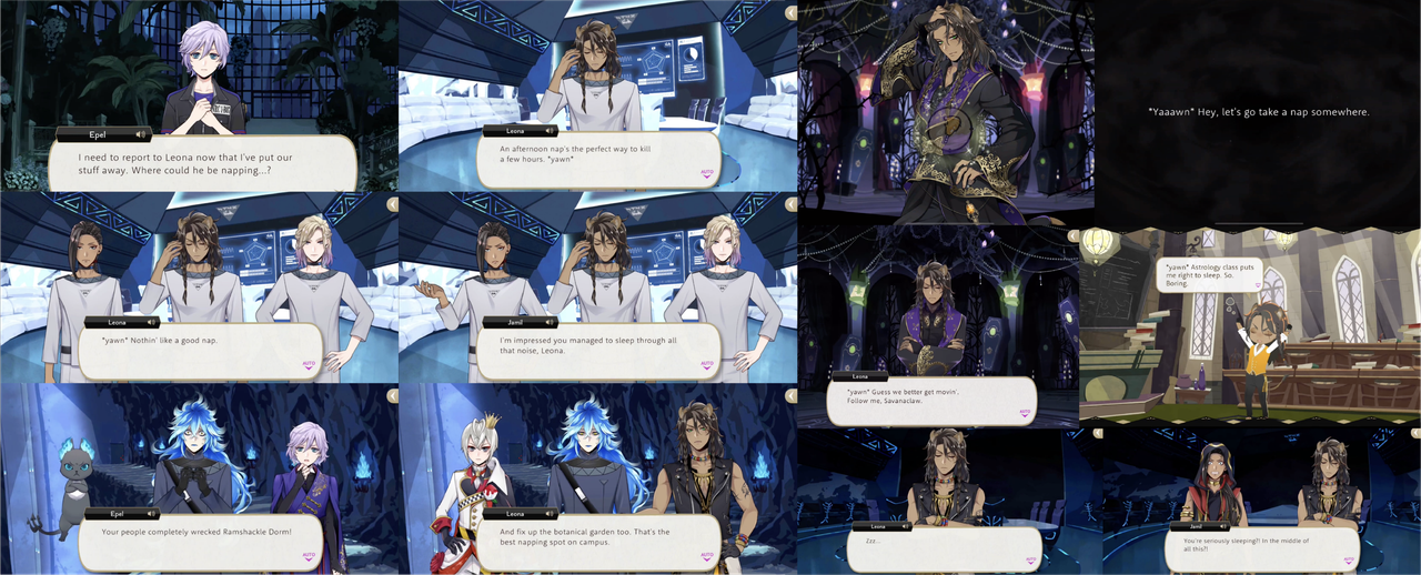 When Trey worries about Riddle in Book 7 Ortho says, “Leona’s right. There’s nothing we can do about it as things stand,” but then begins to panic himself due to having lost contact with Idia. Cater says, “When you’re feeling rushed, that’s when it’s most important to stop and take a step back,” and points out that Leona has fallen asleep under a tree despite the circumstances.