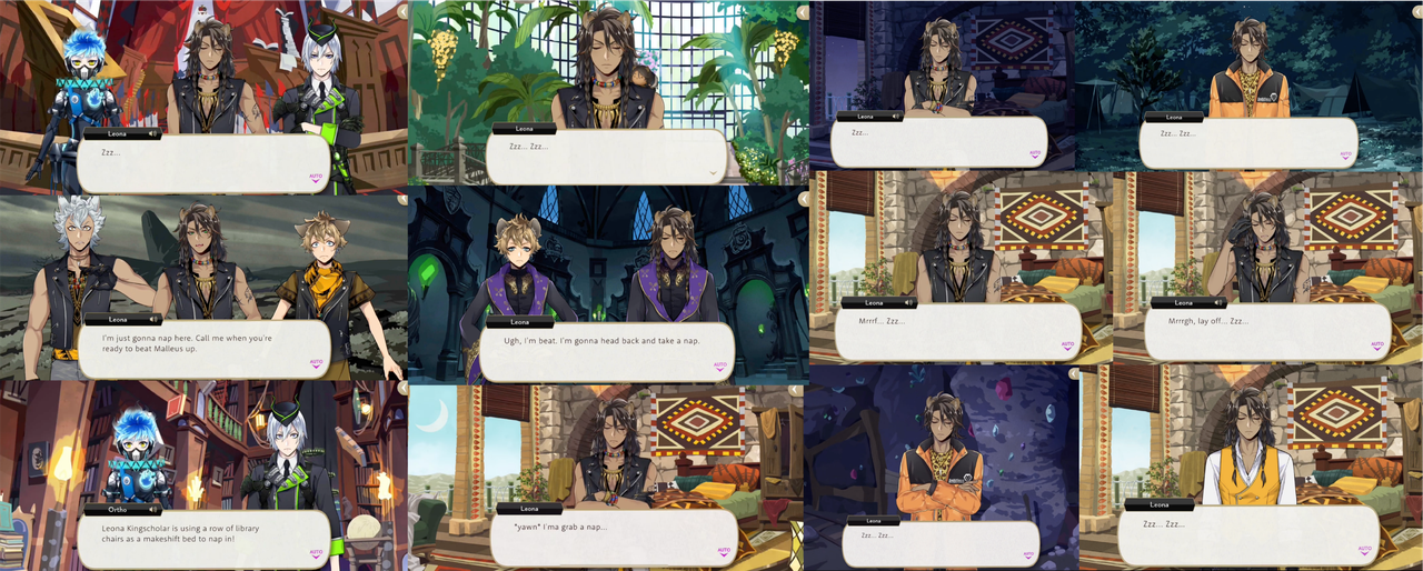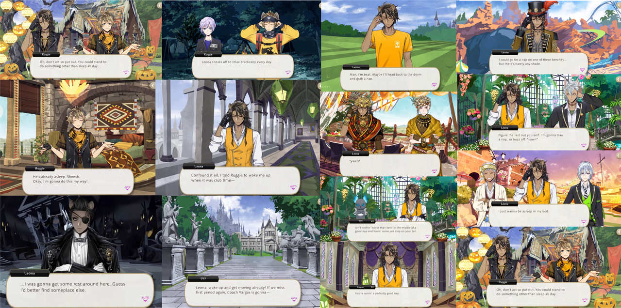 When asked about his tent during Vargas Camp Leona responds that he prefers the gardens, and when the students are insisting upon Idia returning to school at the end of Book 6 Leona says, “fix up the botanical garden too. That’s the best napping spot on campus.”