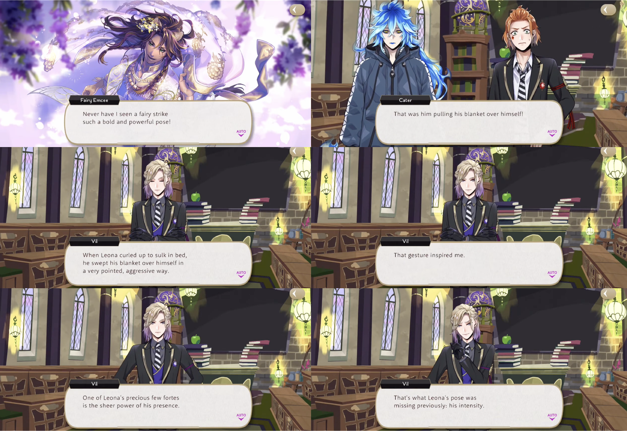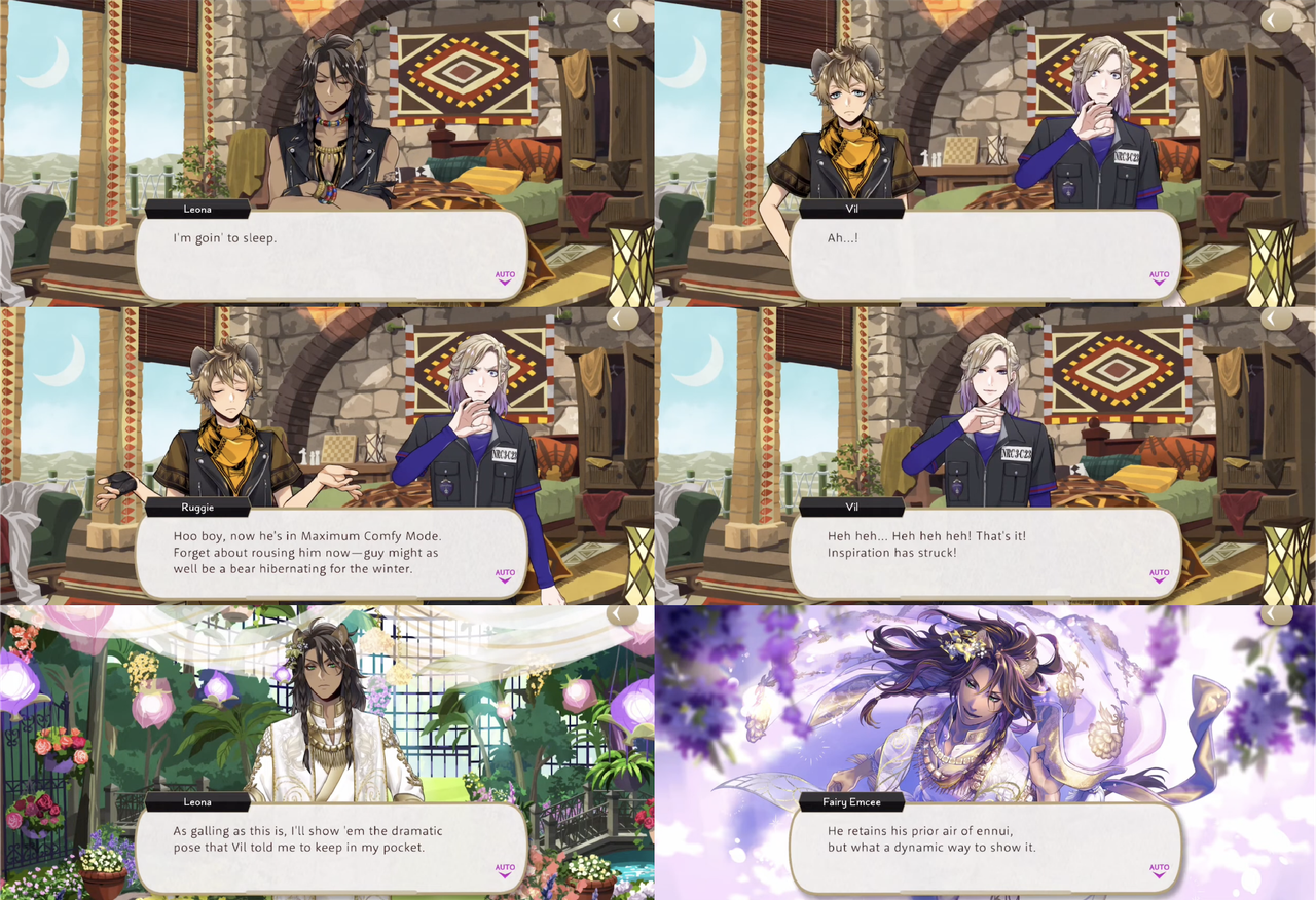Ruggie says, “now he’s in Maximum Comfy Mode. Forget about rousing him now—guy might as well be a bear hibernating for the winter,” but Leona inadvertently inspires Vil, who comes up with a pose for Leona’s runway performance that is reminiscent of Leona pulling his blanket over himself in bed.