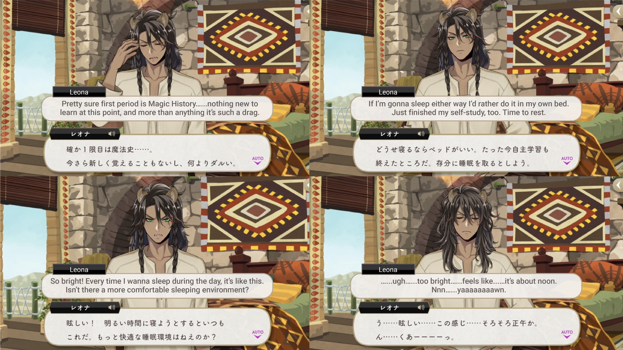 It has yet to be explained why Leona seems to need more sleep than others (another lion-like trait, similar to being a carnivore?), but we might have seen one example as to why in his fifth birthday vignette: Leona stays up all night, deciphering the content of a history book written in a dead language until morning, and which point he finally tries to sleep but struggles in the bright light.