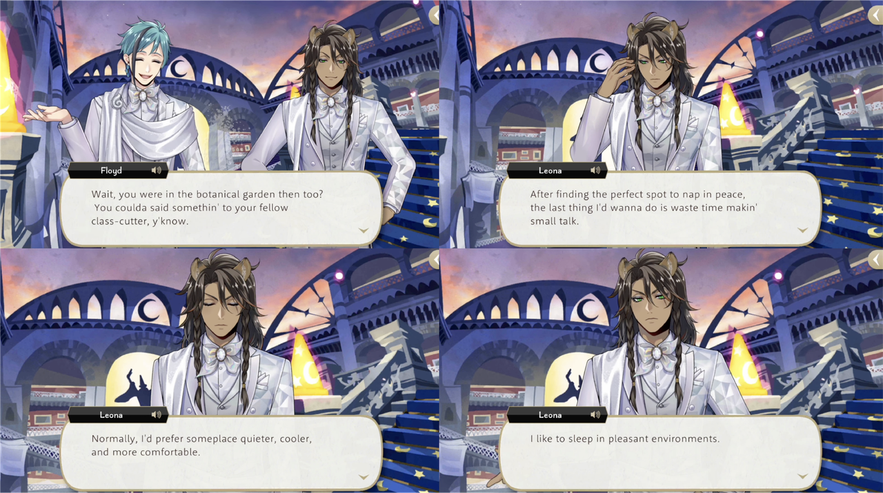 Leona says he spends a lot of time there because it “doesn’t get a lot of foot traffic,” it’s quiet and climate-controlled, but students from savanaclaw and members of the spelldrive club know to look for him there. Leona says, “I’ve been changing up my hiding spots lately just so they won’t find me.Lately I like to go behind the Hall of Mirrors.”