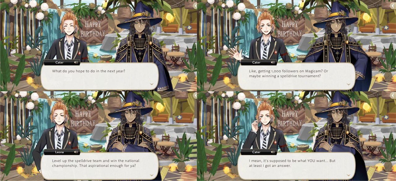 When Cater asks what it is that Leona would like to do in the next year Leona agrees with Cater’s own idea about winning a spelldrive tournament. Cater says, “It’s supposed to be what YOU want… But at least I got an answer.”