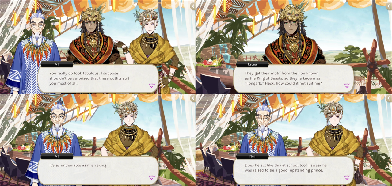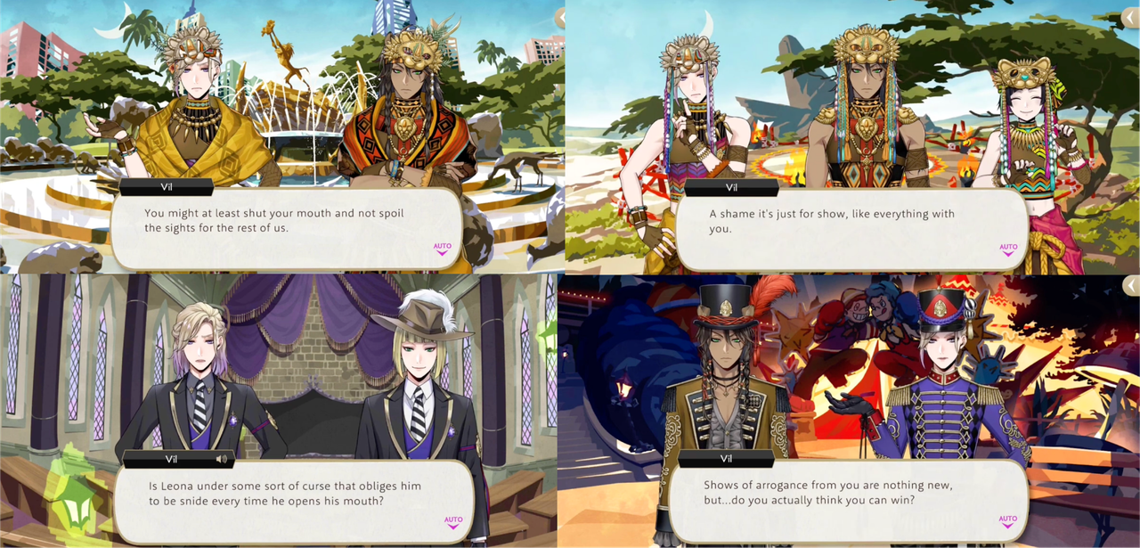 While admitting that Leona looks “fabulous” in his lion garb outfit, when Leona responds with “They get their motif from the lion known as the King of Beasts, so they’re known as ‘liongarb.’ Heck, how could it not suit me?,” Vil responds, “It’s as undeniable as it is vexing.”
