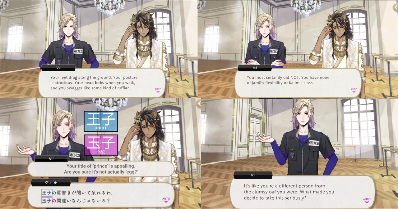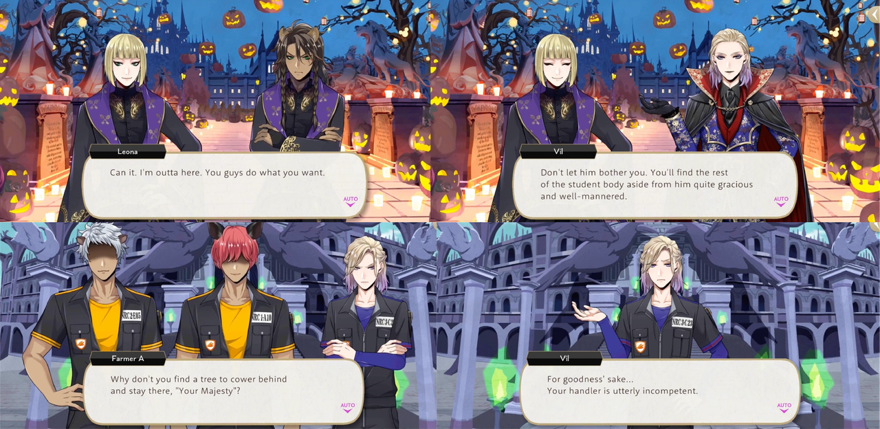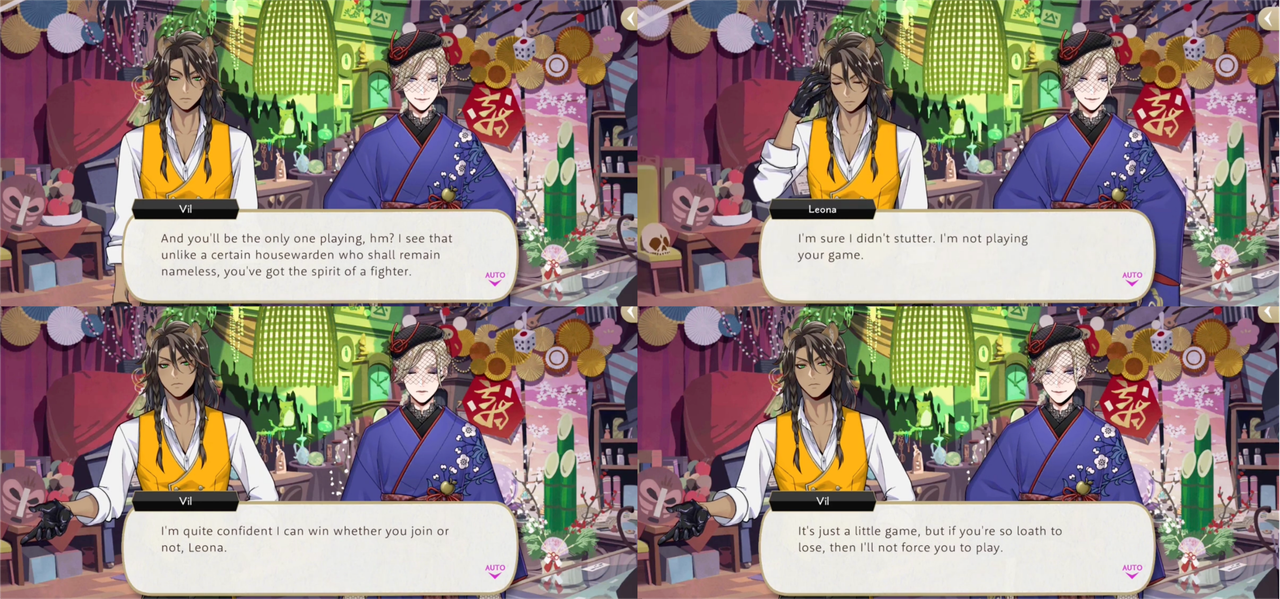 Vil tells Jack, “I see that unlike a certain housewarden who shall remain nameless, you’ve got the spirit of a fighter” and mocks Leona about being loath to lose in a bid to goad him into playing a game during New Year’s, and asks if, as a prince, he has “been taught that an inability to attend to (himself) is somehow acceptable.”