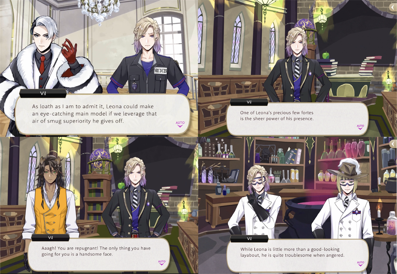 During Fairy Gala alone Vil asks if Leona is not a prince at all but an egg in a kanji-based joke, tells him he swaggers “like some kind of ruffian,” says he has none of Kalim’s class and calls him a clumsy oaf.