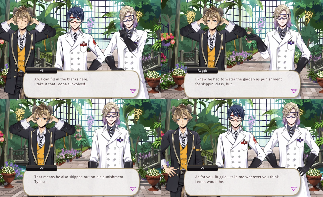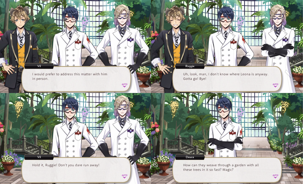 Upon realizing that Leona has failed to water plants in the botanical gardens as he has been assigned Vil physically chases down Ruggie in an attempt to get him to admit where Leona is (Deuce: “How can they weave through a garden with all these trees in it so fast? Magic?”)