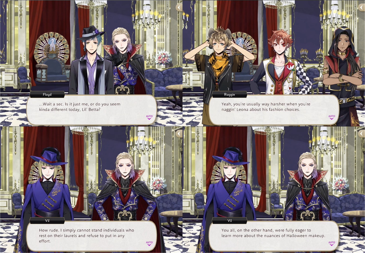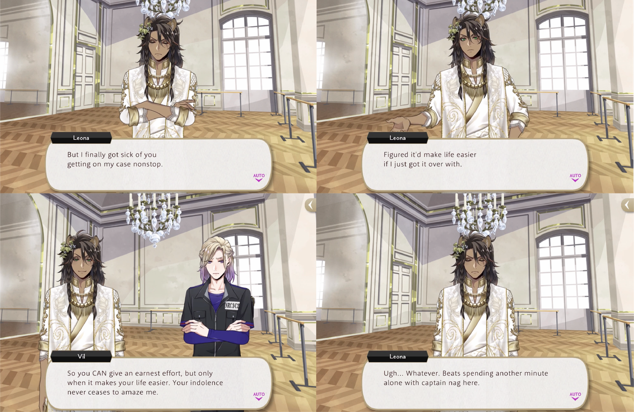 An early vignette consists of Vil scolding Leona for wearing a vest with a loose button (“The way it dangles makes you look no better than a common pauper”) and Leona goading Vil into fixing it himself if it bothers him so much.