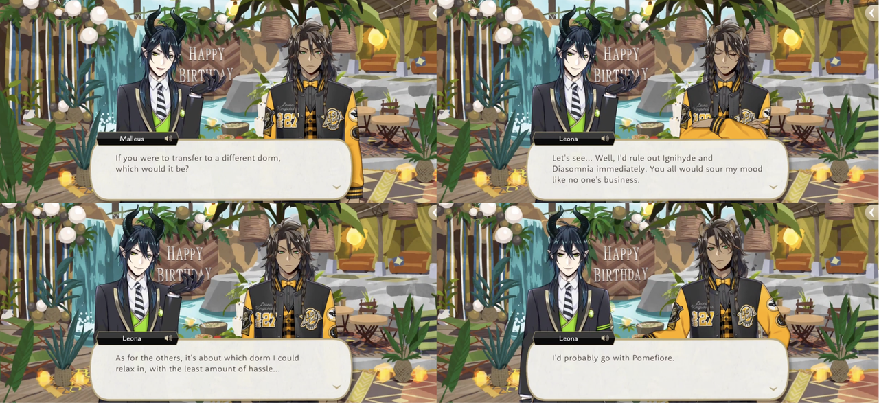 When Malleus asks Leona where he would go if he were to transfer to another dorm Leona rules out Ignihyde and Diasomnia immediately (“You all would sour my mood like no one’s business”), selecting Poemfiore based on which dorm he could relax in, with the least amount of hassle.