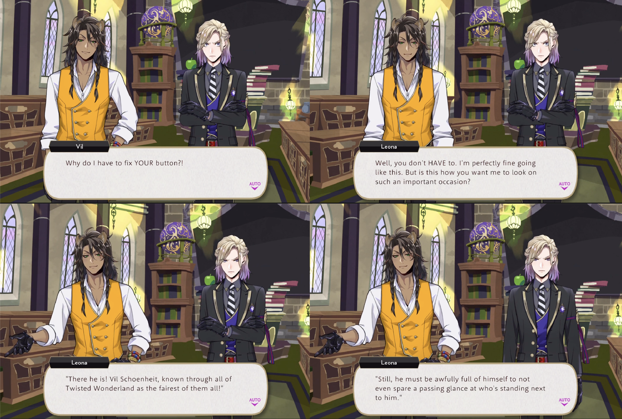 This is also a focus of a vignette where Leona convinces Vil to fix a loose button on his vest merely by refusing to do so himself.
