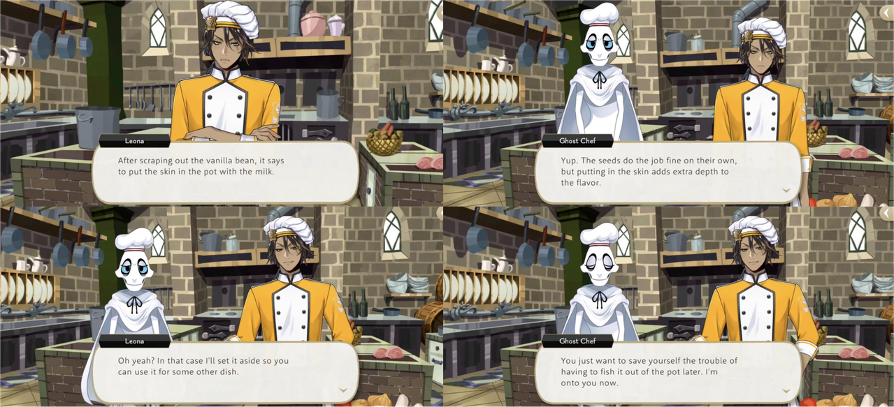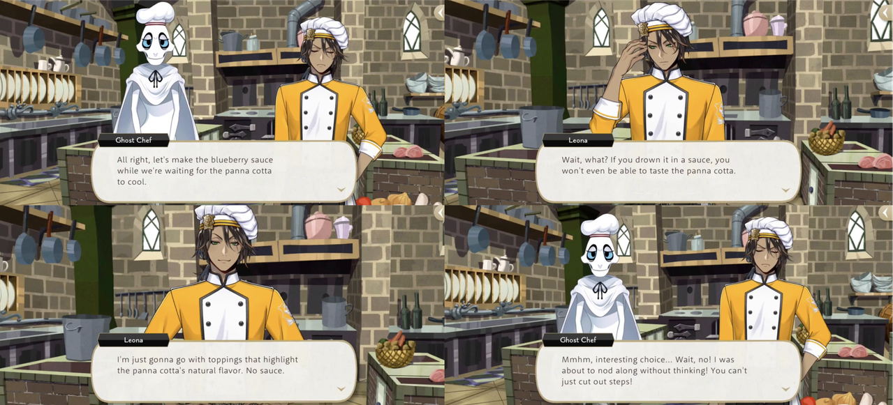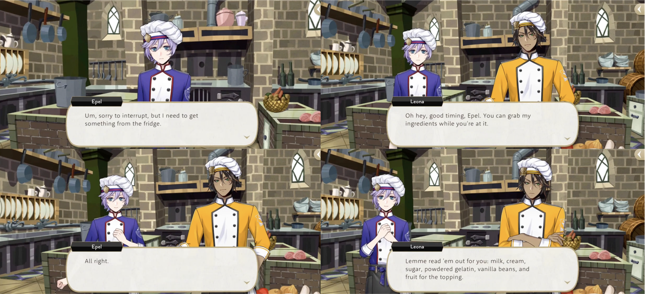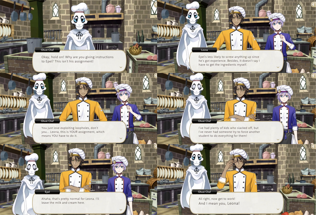 Leona attempts to cut corners repeatedly during his Master Chef course, beginning with having Epel fetch the ingredients he needs from the refrigerator (Epel: “That’s pretty normal for Leona”).