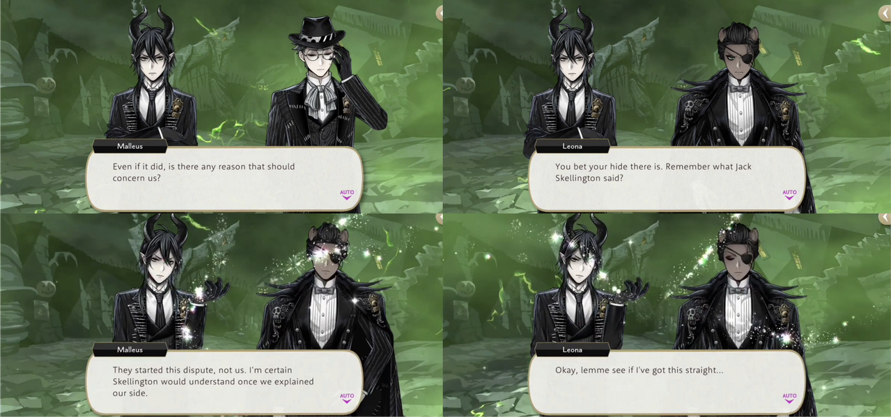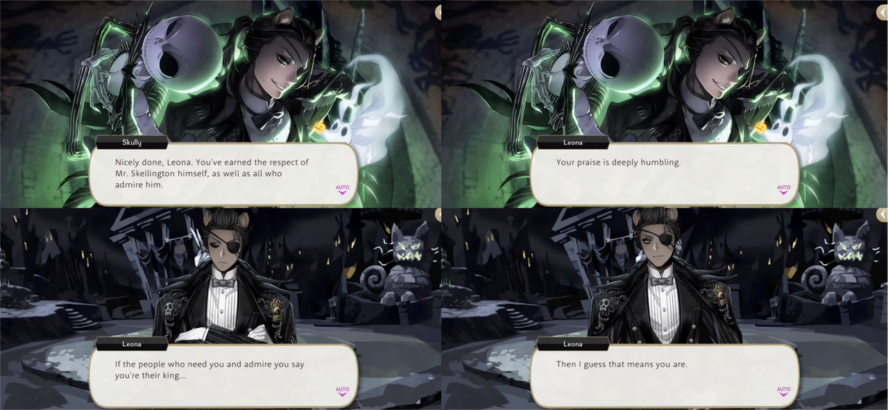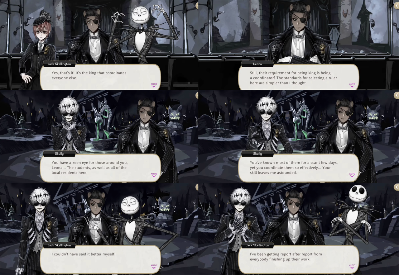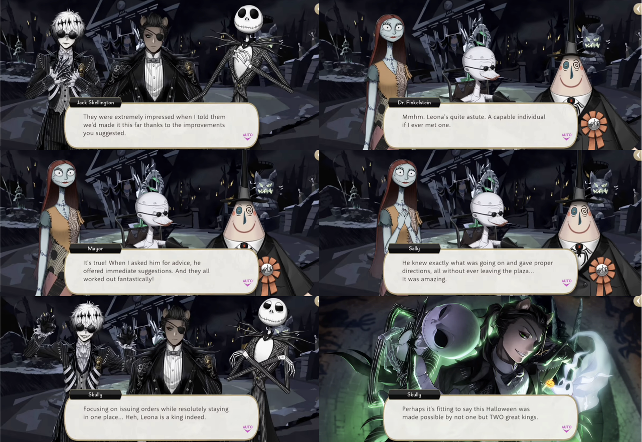 Skully compliments Leona by saying he has a keen eye for everyone around him, both the students from NRC and the local residents of the town: “You’ve known most of them for a scant few days, yet you coordinate them so effectively…your skill leaves me astounded.” Jack Skellington also compliments Leona, mentions how impressed everyone has been with Leona’s suggestions for improvements.