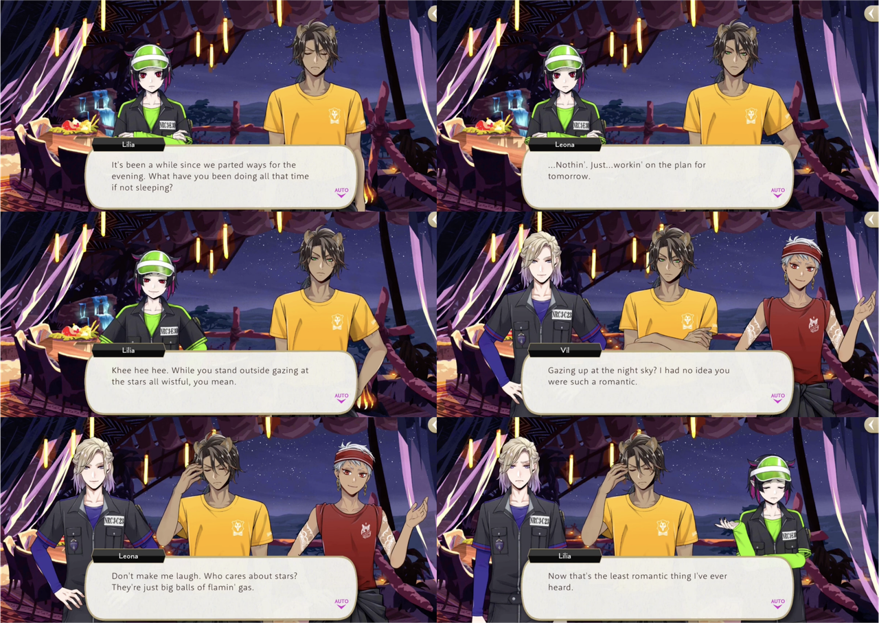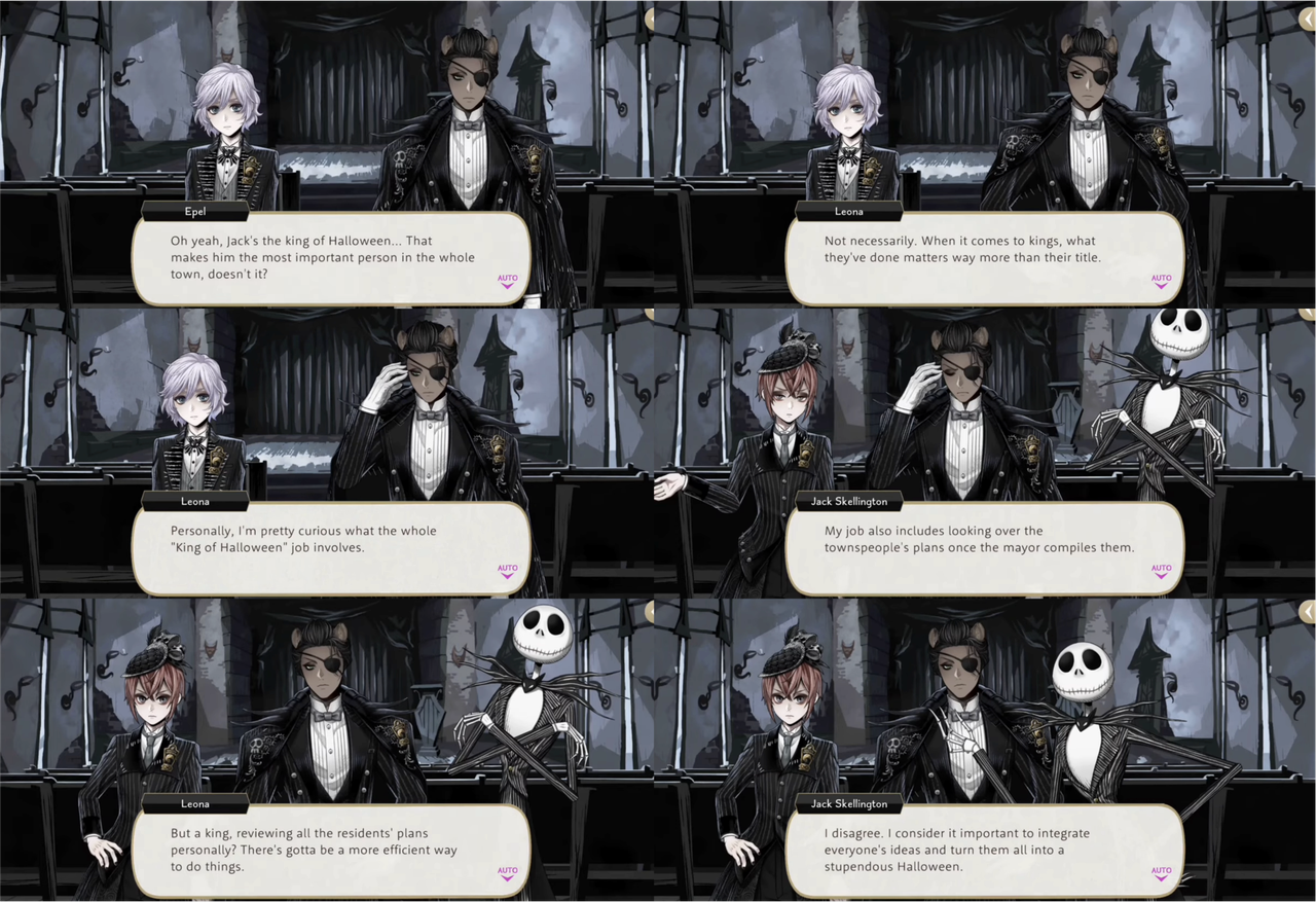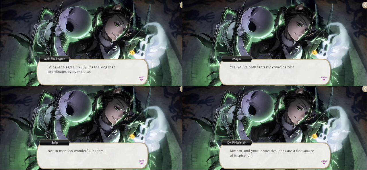 Skully compliments Leona by saying he has a keen eye for everyone around him, both the students from NRC and the local residents of the town: “You’ve known most of them for a scant few days, yet you coordinate them so effectively…your skill leaves me astounded.” Jack Skellington also compliments Leona, mentions how impressed everyone has been with Leona’s suggestions for improvements.