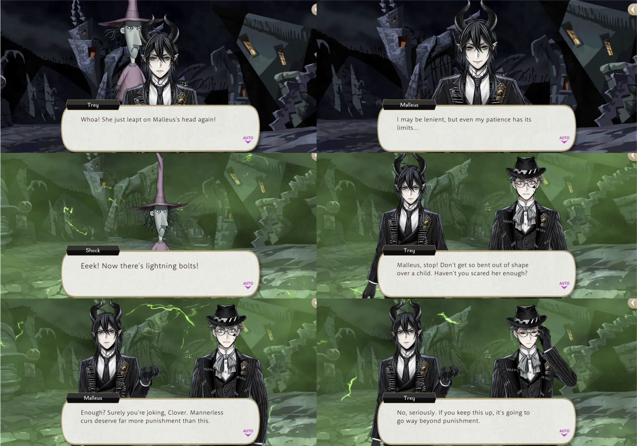 During the NBC event Leona steps in to educate Malleus on how to be a proper king: when Malleus threatens to strike Shock with lightning (“Mannerless curs deserve far more punishment than this”) Leona intervenes, asking, “If it was someone from your kingdom and they got injured, you’d instantly agree it was their own fault, no argument at all?,” and Malleus concedes.