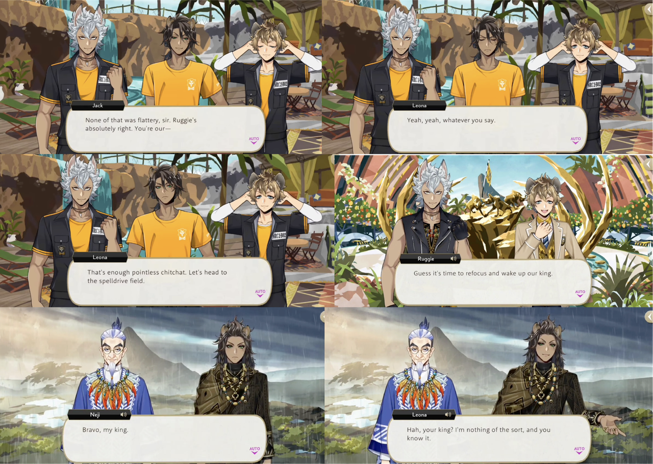 Leona downplays himself, saying, “I snap at a couple of froshes and you call me king? Must be an awfully cheap crown,” but Jack insists that it wasn’t just flattery and “Ruggie’s absolutely right. You’re our —,” but Leona interrupts the “pointless chitchat” before he can finish.