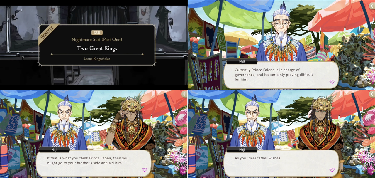 Leona’s NBC vignette is titled “Two Great Kings,” where he is shown being an effective and admired leader in what is possibly contributing to his frustration with never becoming king: Leona seems to be presented in the game as someone who would become a good king, to the point that his father wishes that he would aid his struggling brother, the actual crown prince.