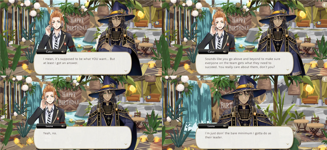 Ruggie has also noticed Leona’s downplaying: when Leona claims he is only looking to get refreshments for his dormmates during Halloween because “their brains are in their stomachs” Ruggie responds, “Can’t you just admit you wanna do something nice?”