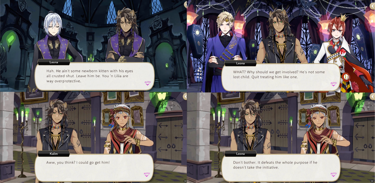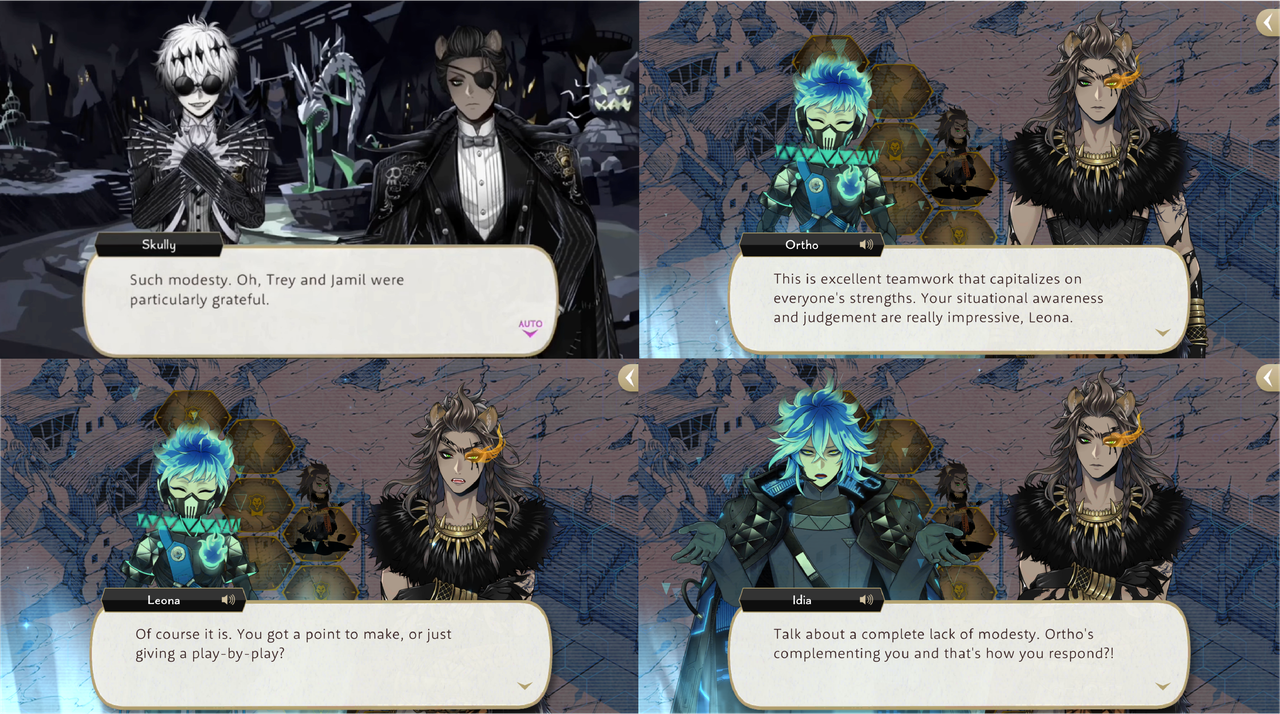 Idia in particular seems to take what Leona says at face value: he agrees that Leona does not seem to pay attention to others (“I never took you for a guy with his finger on the pulse of the community, Leona”), and when Leona asks if Ortho has a point to make after complimenting Leona in Book 7 Idia responds, “Talk about a complete lack of modesty,” in a complete opposite evaluation of Leona to characters like Skully, who might be more perceptive.