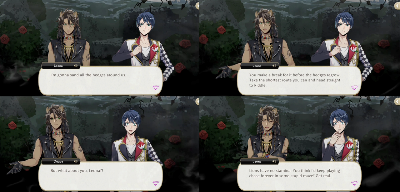 This is in contrast to the drama of Book 7 where Leona insists on staying behind to battle the darkness of Riddle’s mind and sends Deuce on without him: when Deuce balks at the idea of leaving Leona behind Leona responds, “Lions have no stamina,” but this was possibly a lie meant to convince Deuce to let him sacrifice himself and buy Deuce time.