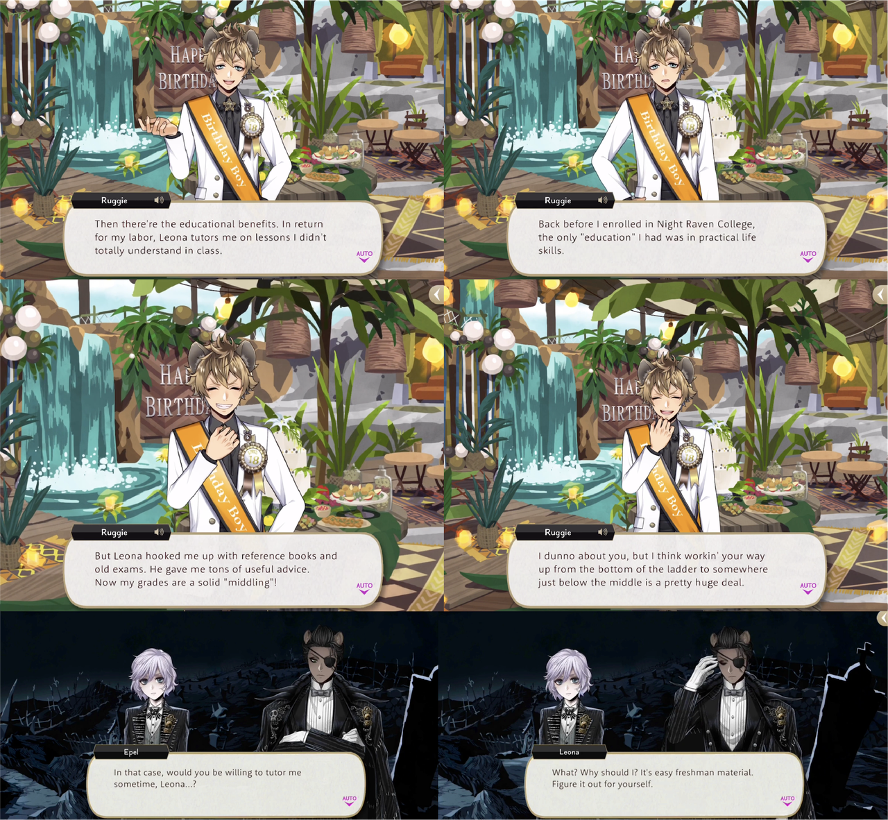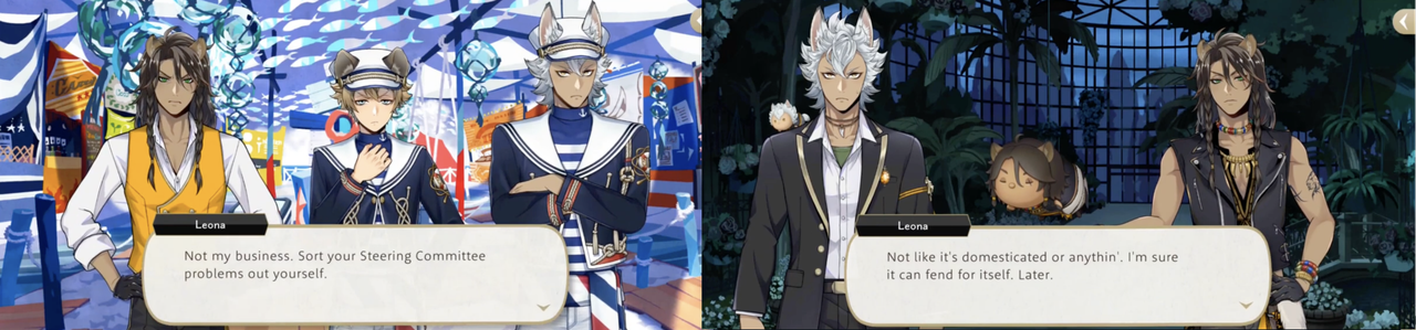 Leona also refuses a request for help from Ruggie and Jack during Port Fest, refuses when Epel asks him for tutoring (though he does tutor Ruggie) and leaves his tsum on its own, saying, “Not like it’s domesticated or anythin’. I’m sure it can fend for itself.”