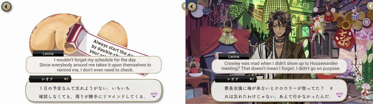 Leona says, “Crowley was mad when I didn’t show up to Housewarden meeting? That doesn’t mean I forgot. I didn’t go on purpose.”
