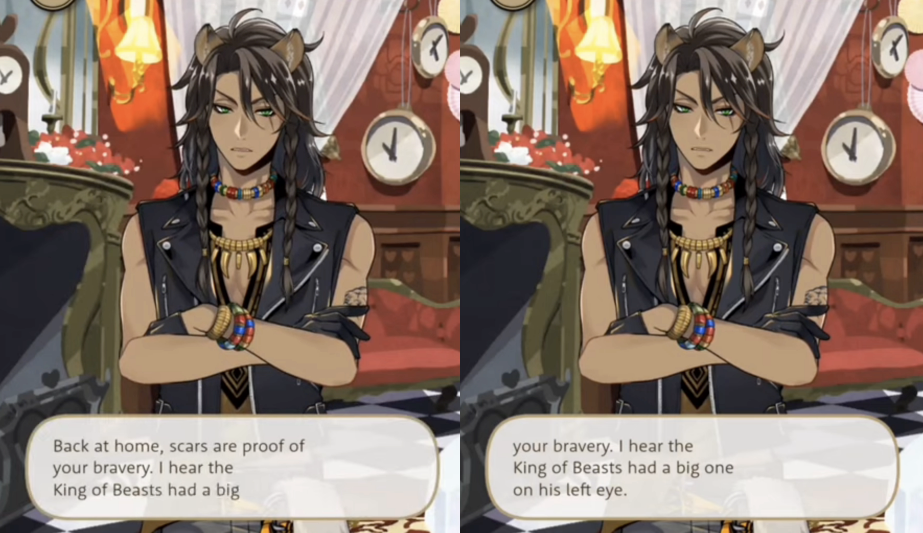 “Also like the King of Beasts, (Leona) has a scar over his left eye. The King of Beasts’ scar is said to be a brave wound that he sustained while protecting his pride, but when asked how he got his scar Leona will say ‘I forgot,’ and will not go into any detail.”