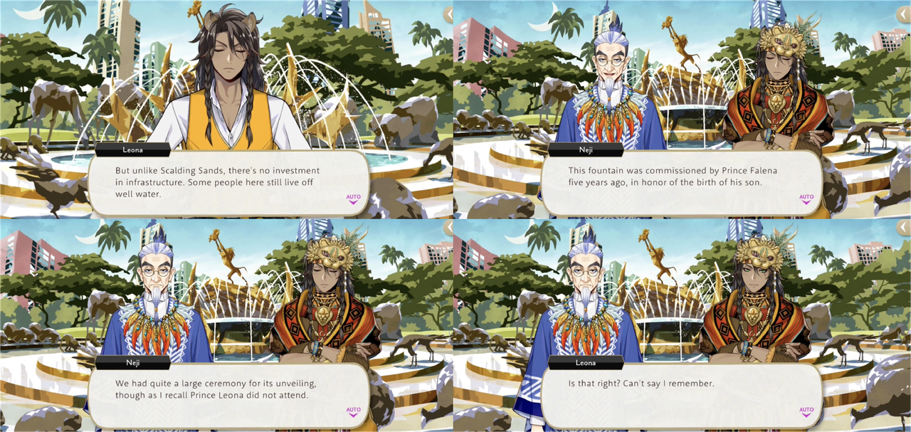 Leona also did not attend the unveiling of the fountain that Falena commissioned in honor of the birth of his son. When Kifaji brings this up Leona responds, “Is that right? Can’t say I remember.”