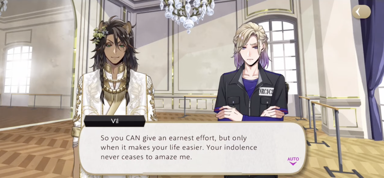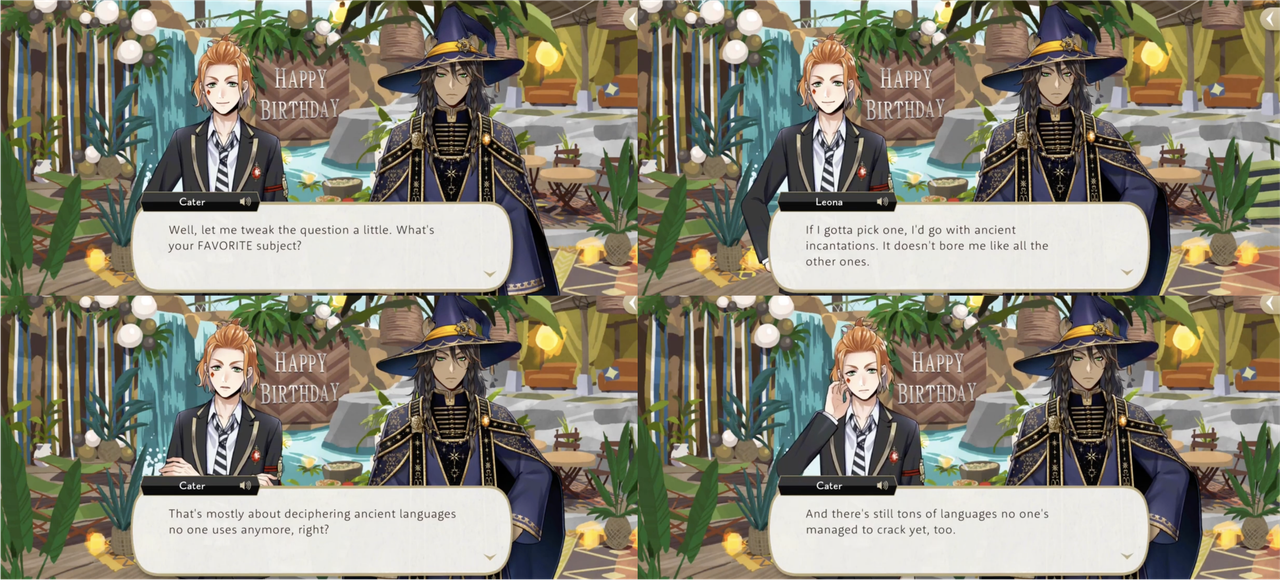(A lot of work for the favorite class of a character who is infamous for his dislike of putting in effort, Vil claims that Leona only gives an honest effort with things that make his life easier, but this also seems to apply to tasks that challenge him, such as when he stays up all night deciphering a history book on ancient food preservation methods on his birthday, for fun.)