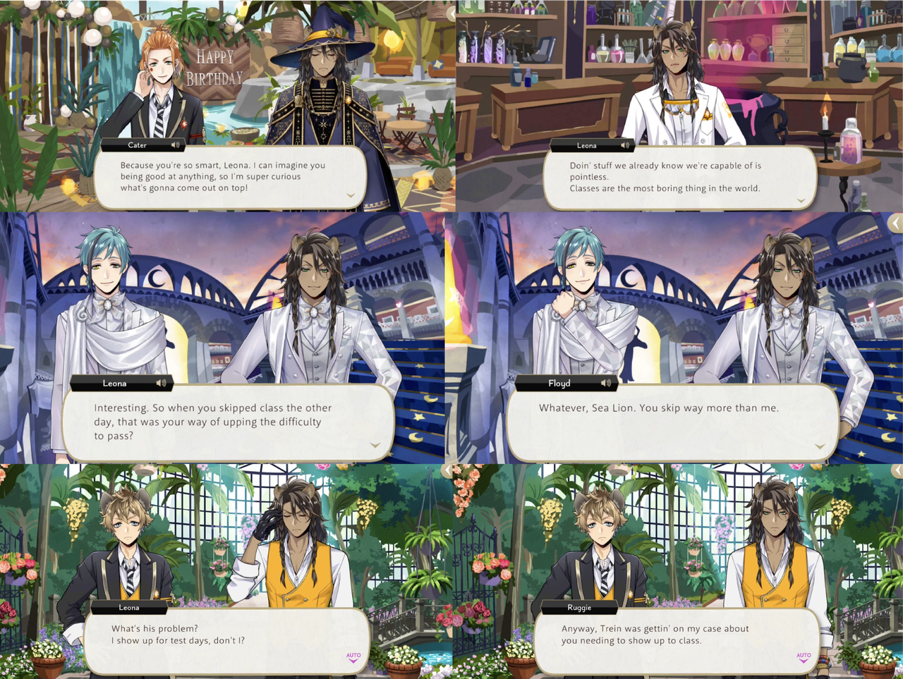 Leona being objectively more intelligent than most seems to be well known by the other characters: Vil says, “As loath as I am to admit it, (Leona) wasn’t wrong when he said he was smarter than the rest of us,” and Cater’s cover story for bringing Leona into the Heartslabyul of Trey’s dream is wanting to receive tutoring “from the big brains,” also saying Leona is “so smart.”