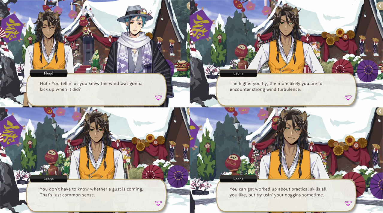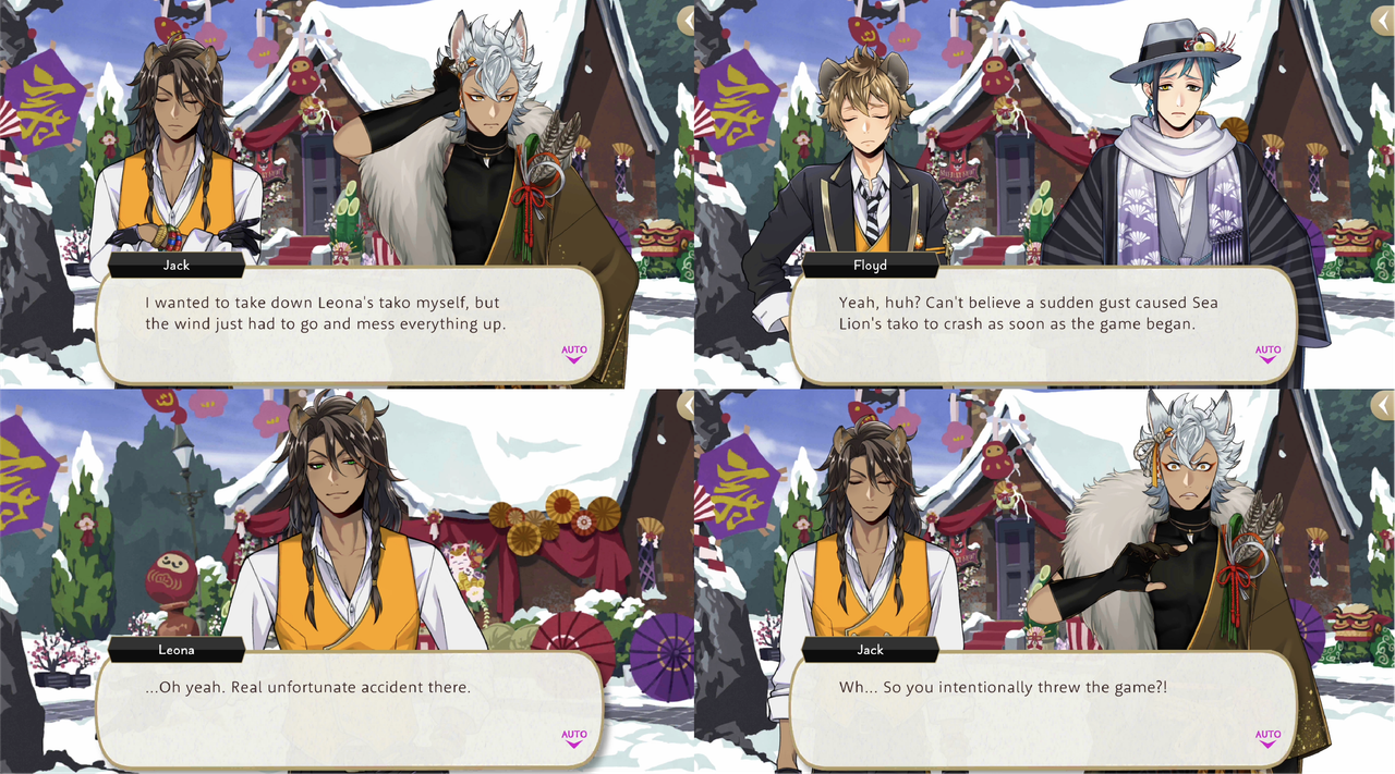 During New Year’s Leona loses a tako battle against Jack and Floyd. Floyd observes, “Can’t believe a sudden gust caused Sea Lion’s tako to crash as soon as the game began,” but it is revealed that Leona was able to throw the competition on purpose because of his understanding of wind turbulence.