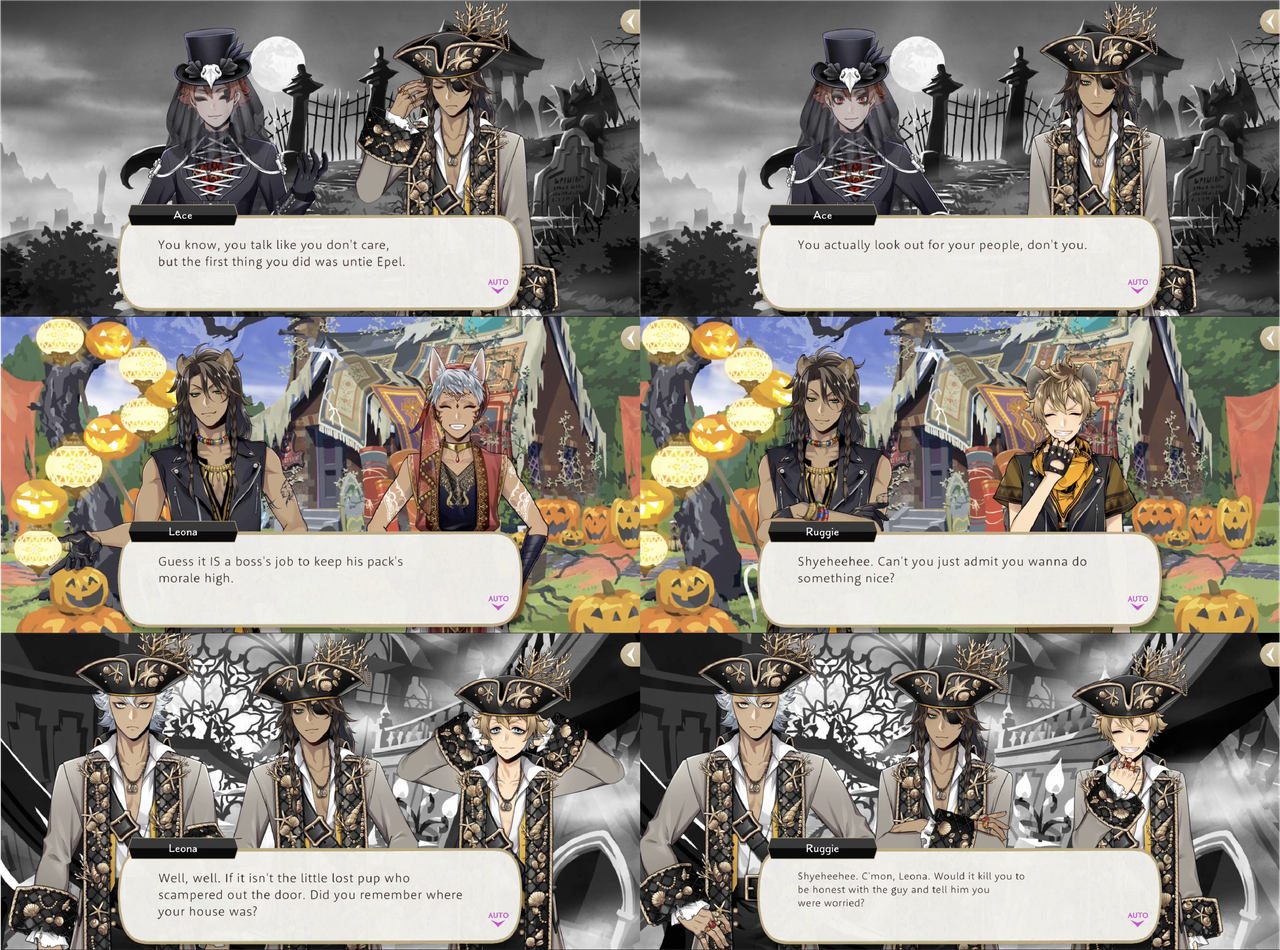 Certain characters in the game seem to be catching on to the contrast between Leona’s words and actions betraying when he is downplaying his worry or efforts for others: Ace observes, “You know, you talk like you don’t care, but…you actually look out for your people, don’t you,” during Spectral Soiree, and Ruggie calls Leona out for wanting to do something nice for the dorm while downplaying it, and for worrying about Jack during Spectral Soiree despite greeting him with, “Did you remember where your house was?”