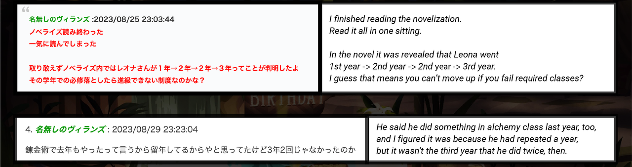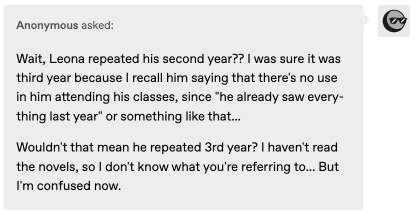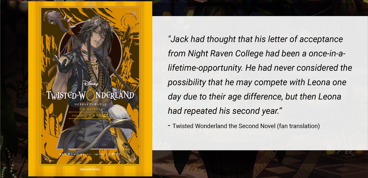 So it seems not an uncommon interpretation that Leona repeated his third year. Is Leona repeating his second year only canon to the novel? Maybe, and maybe one day there will be a more solid confirmation from the game, and then we will know for sure.
