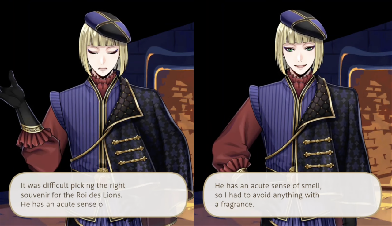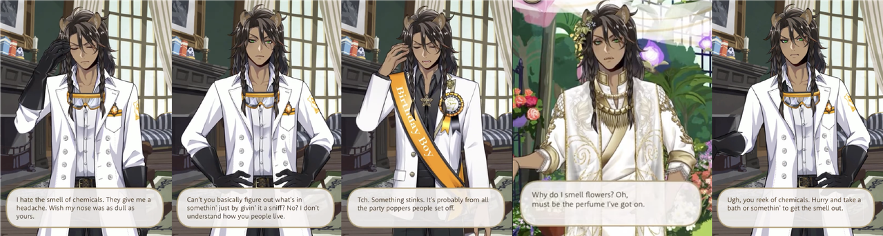 Rook says that it is difficult to pick our souvenirs for Leona due to his acute sense of smell, Leona complains of his ceremonial robes smelling “like lizard” after Malleus has worn them, and says all the sugar in the kitchen of Trey’s dream threatens to ruin his sense of smell.