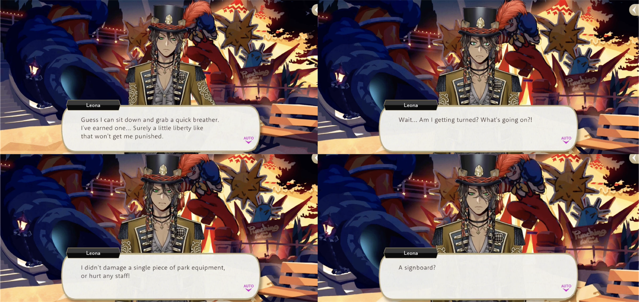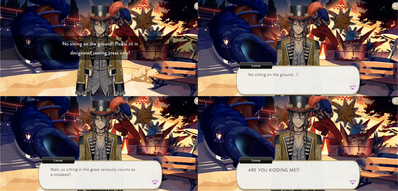It is possibly due to this same line of thinking that Leona chooses to rest after outsmarting the Playfulland puppets, which leads to his downfall when he chooses to sit on the ground rather than in designated seating, thus breaking a rule of the park.