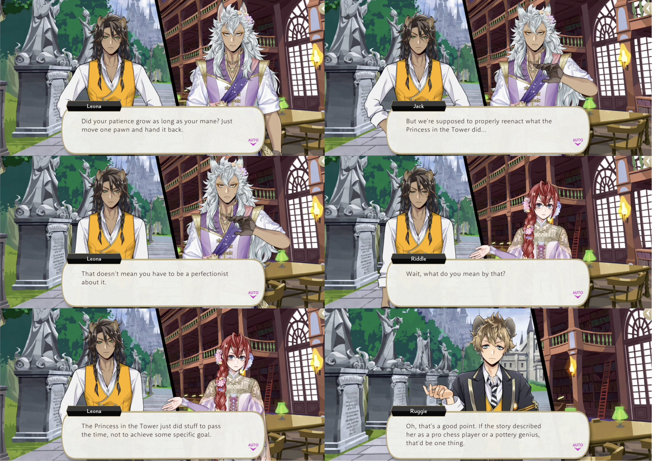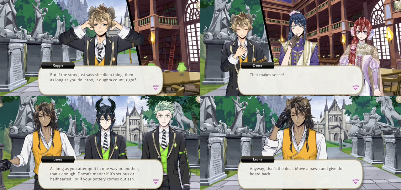 Leona brings over his own chessboard to help Jack and the lantern-event team when they become trapped in the school’s library and corrects their plan to go through every step of the story they are following to perfection: “As long as you attempt it in one way or another, that’s enough. Doesn’t matter if it’s serious or halfhearted…or if your pottery comes out ash.”