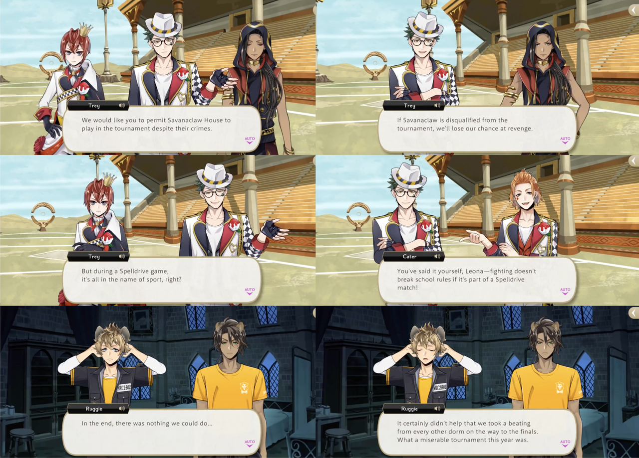 Leona uses such a loophole in Book 2 when he allows students of his dorm to physically and magically fight against the group of Cater, Ace, Deuce and Grim via a spelldrive match (“it doesn’t violate any school rules to cast spells during a game of Spelldrive”), but this tactic comes back to bite him him in the end when Trey, Jamil and the rest of the injured students ask that Savanaclaw not be disqualified from the spelldrive tournament specifically so that they can have their revenge, with Cater saying, “You’ve said it yourself, Leona-fighting doesn’t break school rules if it’s part of a Spelldrive match!”