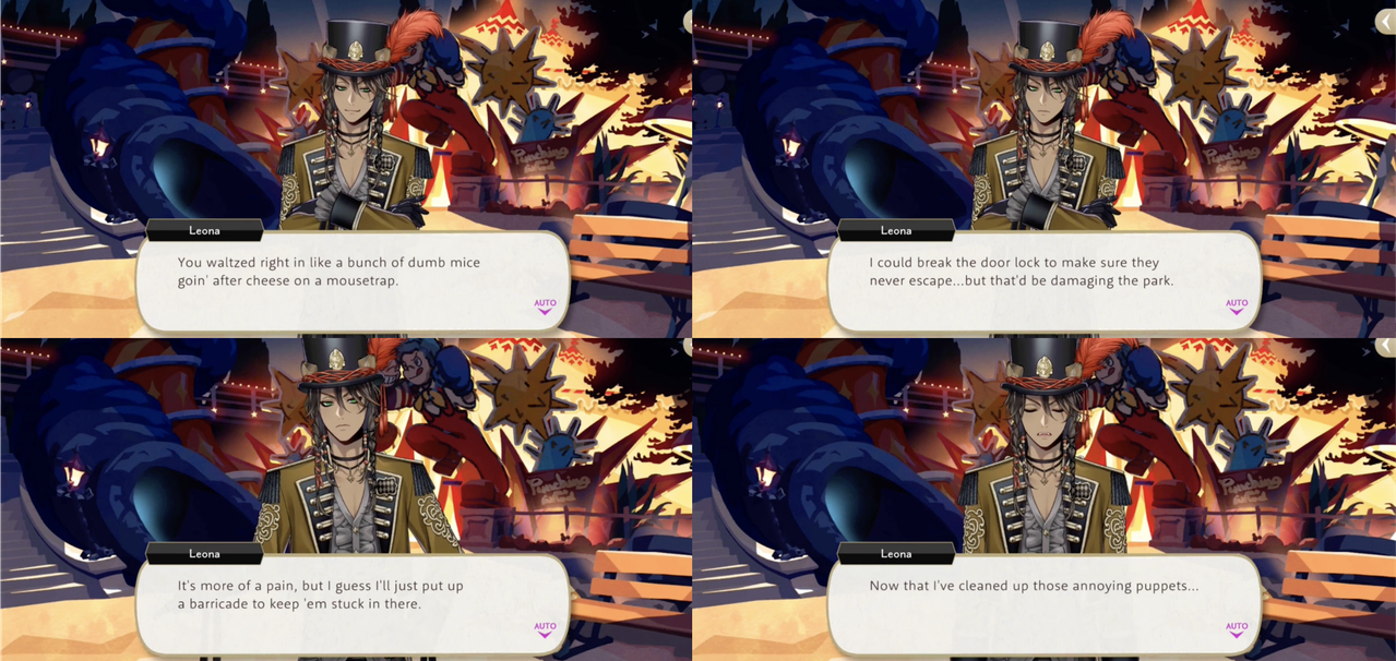 During Playfulland Leona is the first person to come up with a successful strategy against the puppets: he sends the student group on ahead while staying behind to deal with a hoard of puppets on his own, locking them inside a building and thus thwarting them without suffering the consequences of doing damage to the park or breaking any rules.