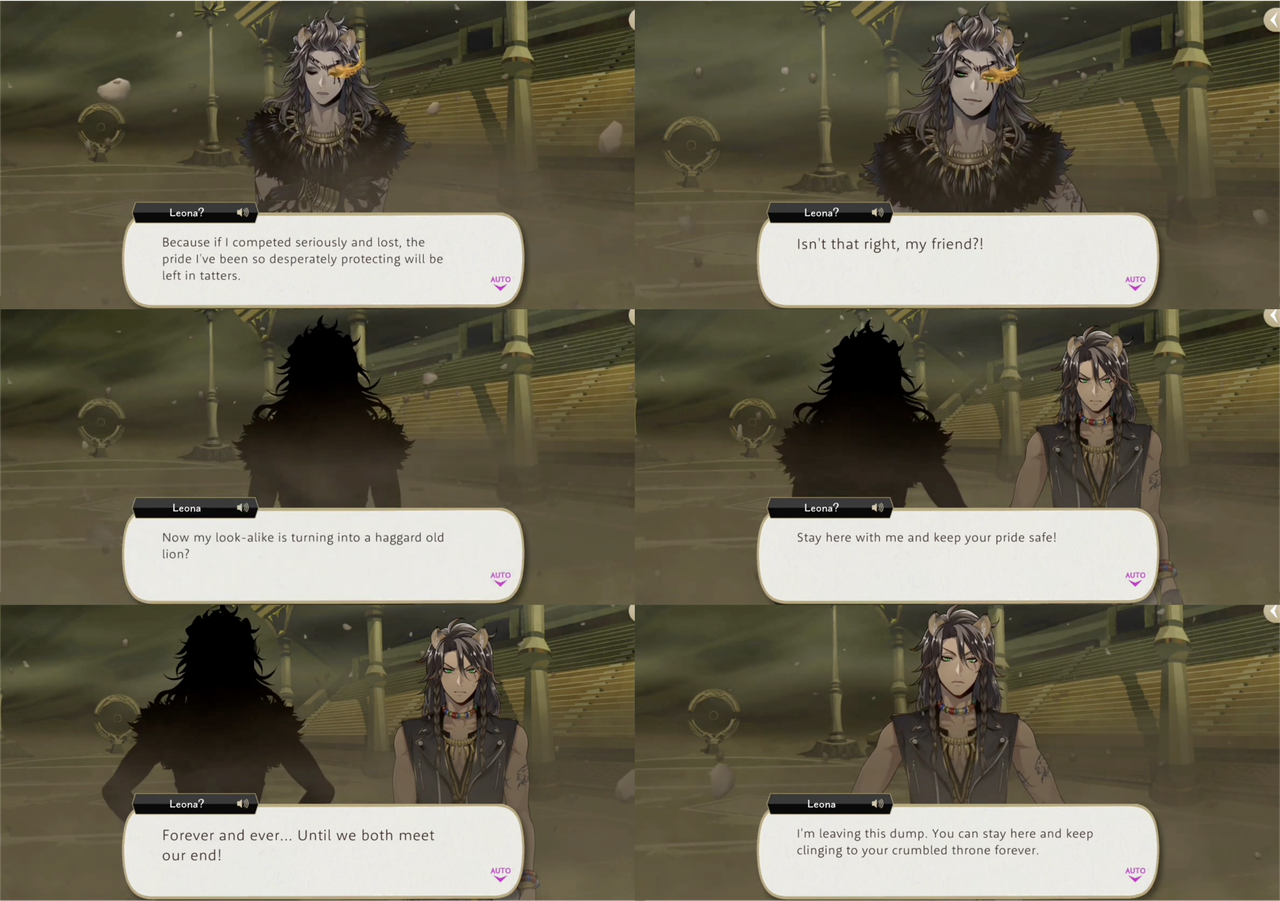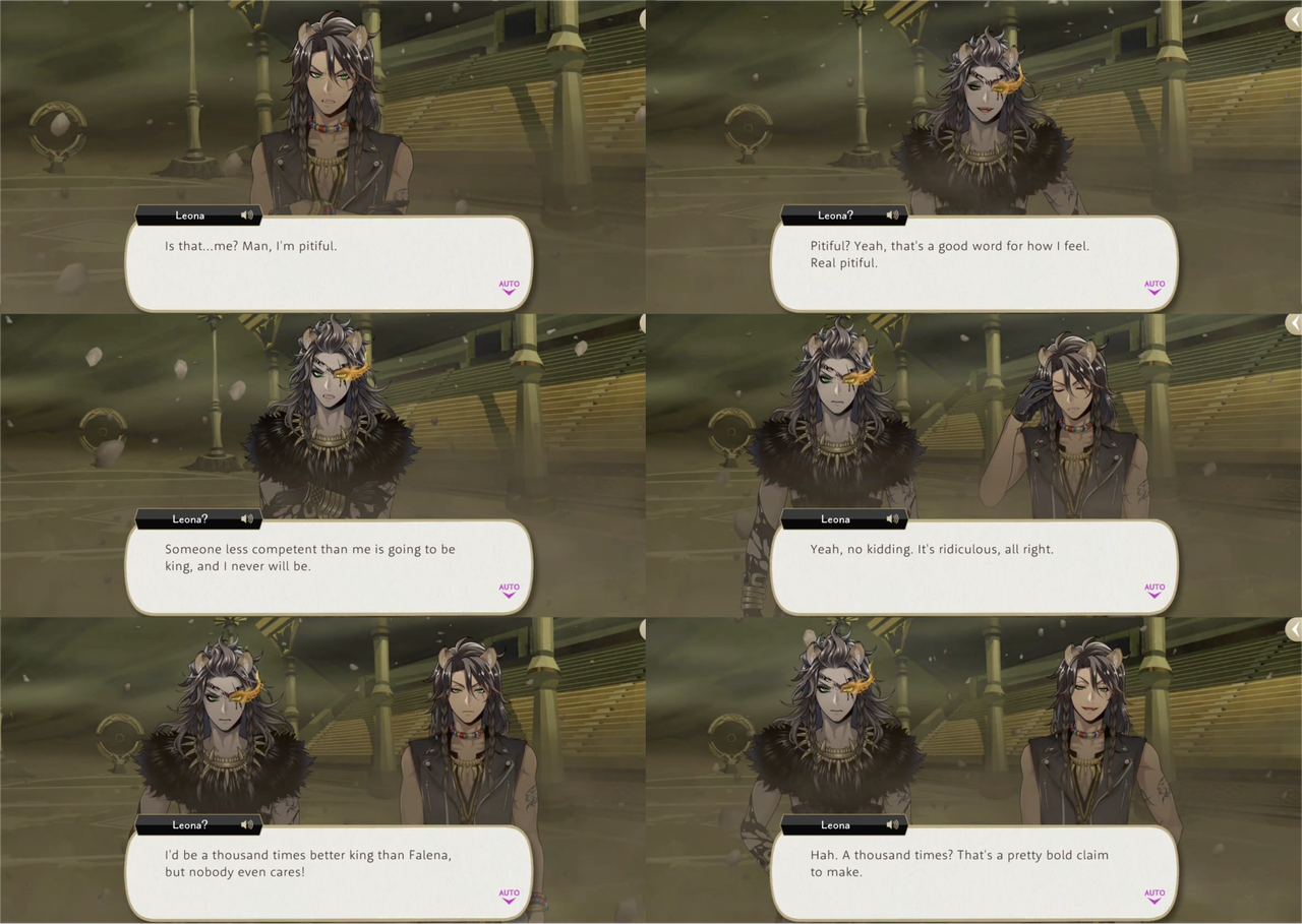 When the overblotted, darkness-Leona claims he would be a thousand times better king than Falena Leona responds, “A thousand times? That’s a pretty bold claim to make…For a guy who looks down on everyone, you’re pathetically desperate for recognition…And you never put in any effort to earn it…I can’t stand the sight of it. But I guess that’s me, huh.”