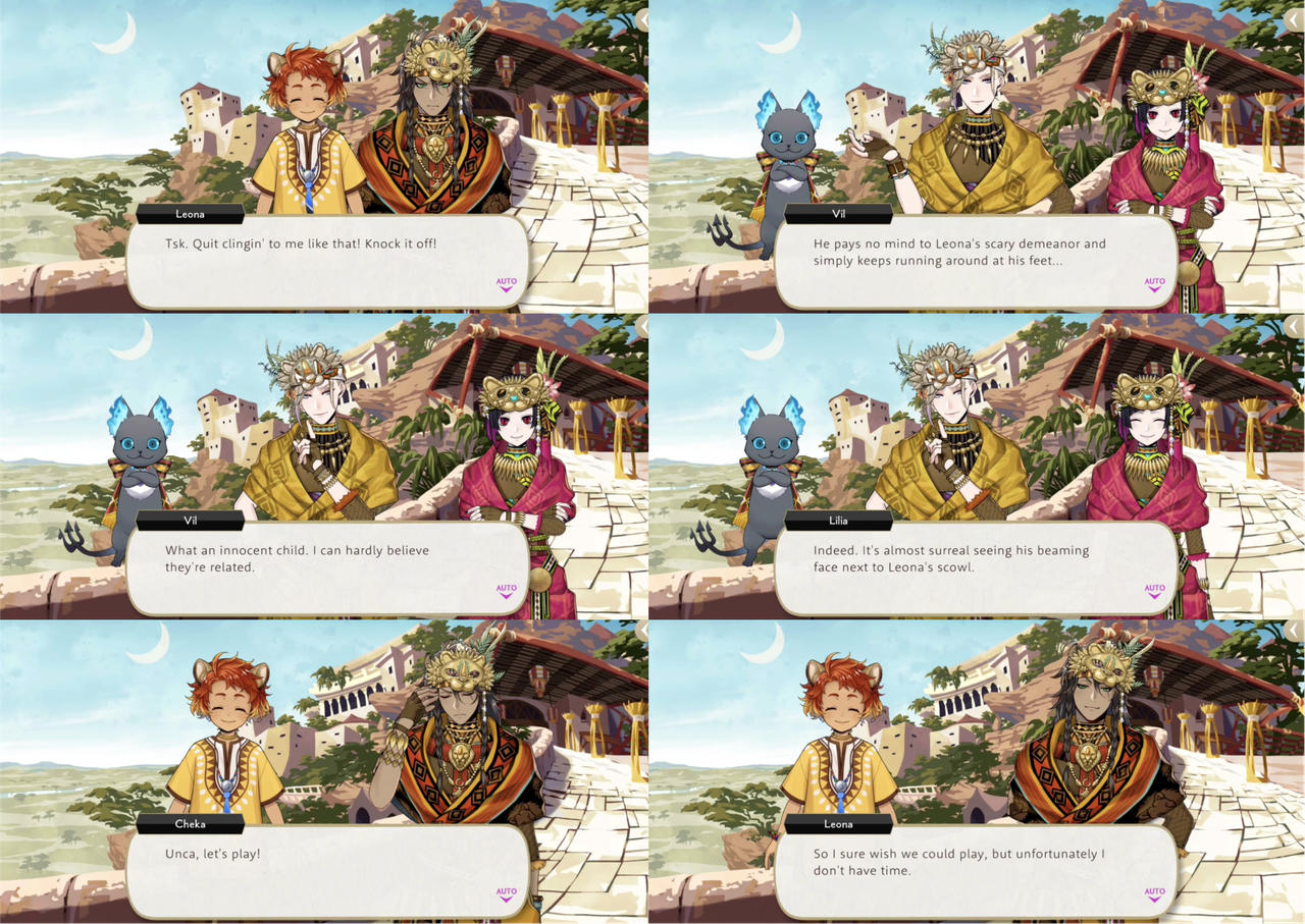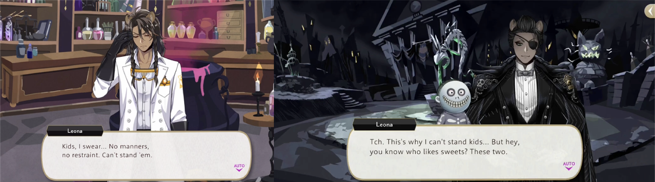Vil observes, “He pays no mind to Leona’s scary demeanor and simply keeps running around at his feet…What an innocent child. I can hardly believe they’re related.”