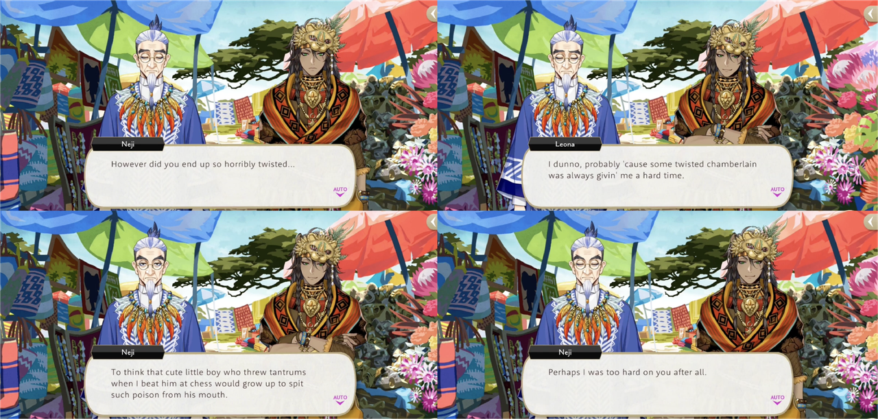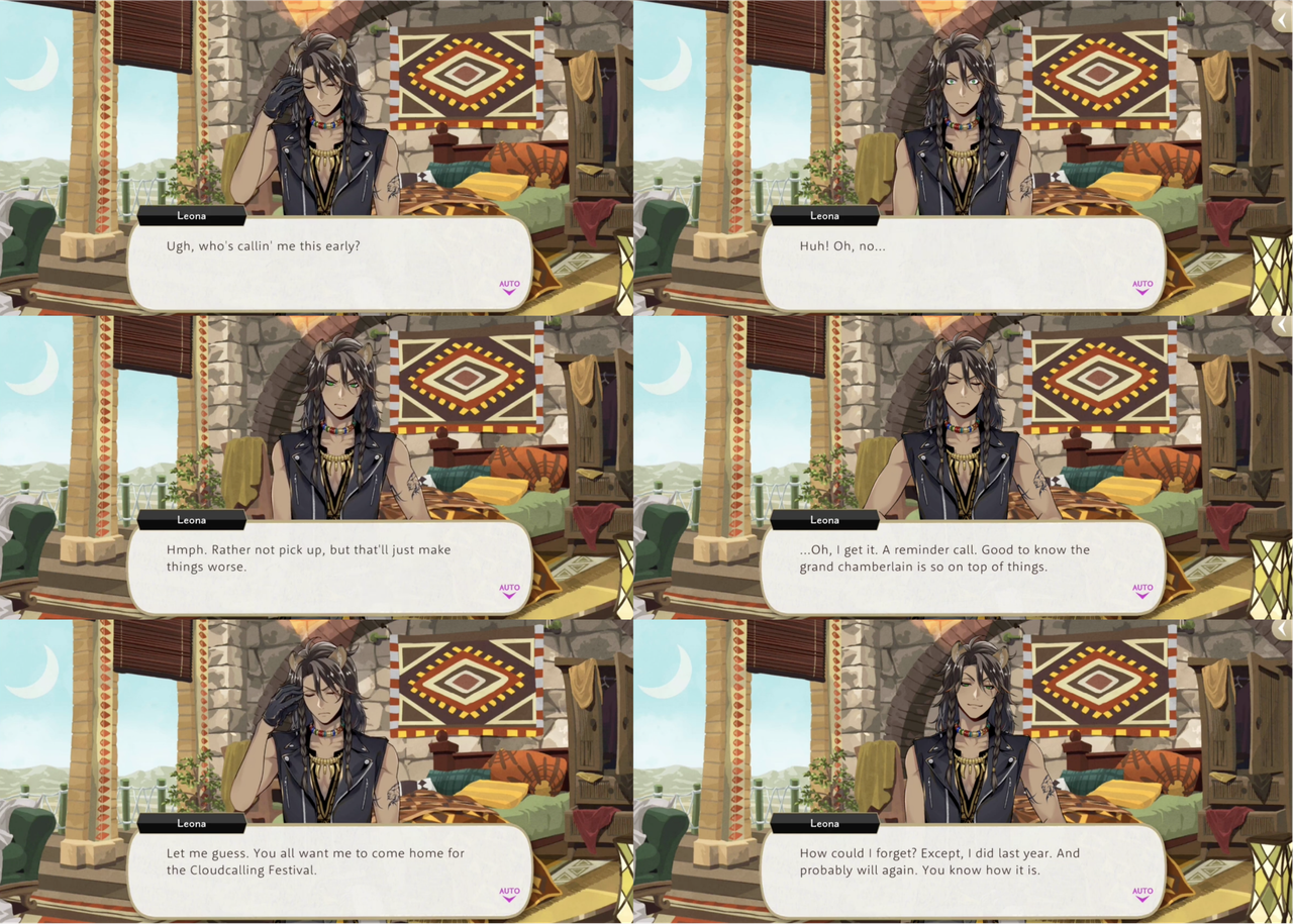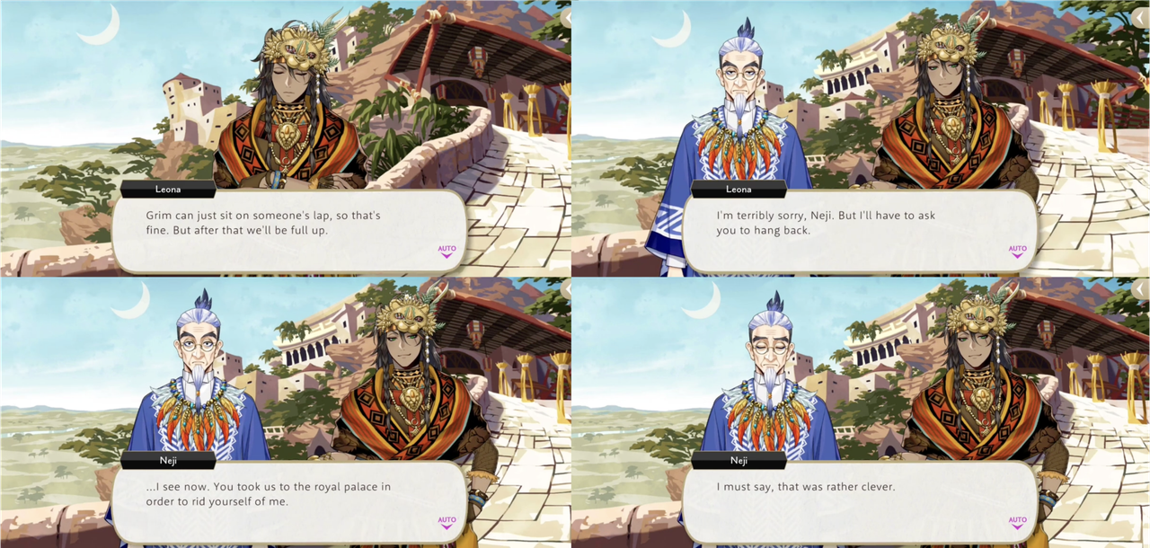 After Leona returns home Kifaji reminds him that one of his responsibilities as grand chamberlain is preventing predicaments that will cause Prince Falena hardships, asking Leona to avoid causing his brother “any undue trouble.”
