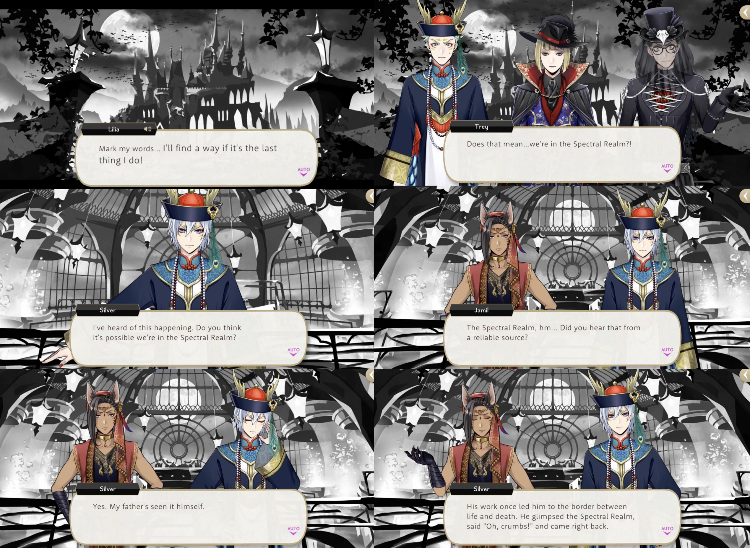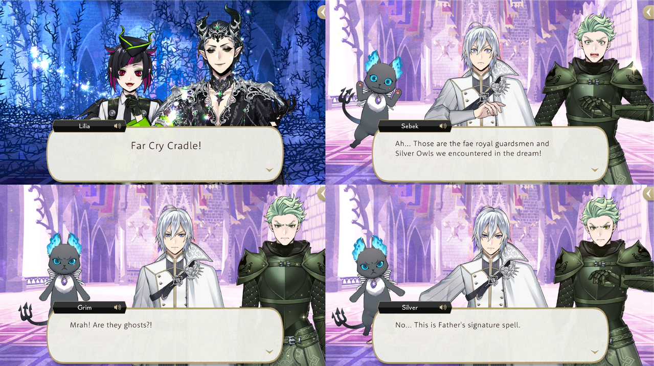 Lilia seems to combine his unique magic with Malleus’ magic in Book 7 to “conjure memories of the throne room (of Castle Wildrose) from bygone days” that others can see as well. Grim asks if the projections of fae royal guardsmen and Silver Owls are ghosts and Silver says no. Lilia also conjures apparitions of Silver’s birth parents, and Malleus’ mother.