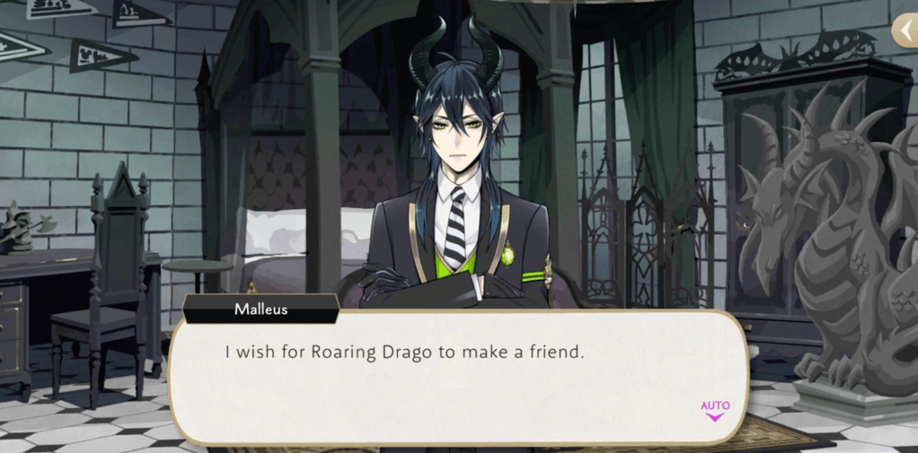 Malleus comments on Ace being friends with the prefect, and his wish for the Wish Upon a Star event is for his tamagotchi Roaring Drago to make a friend.