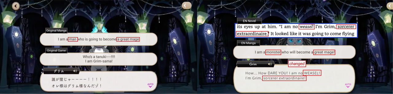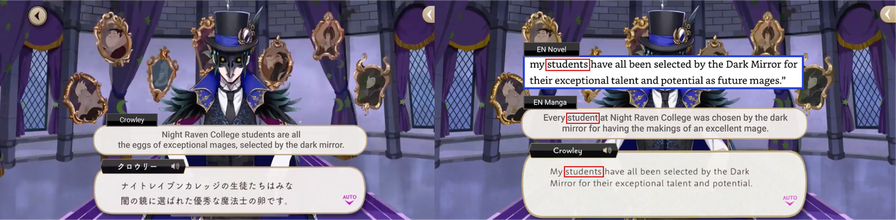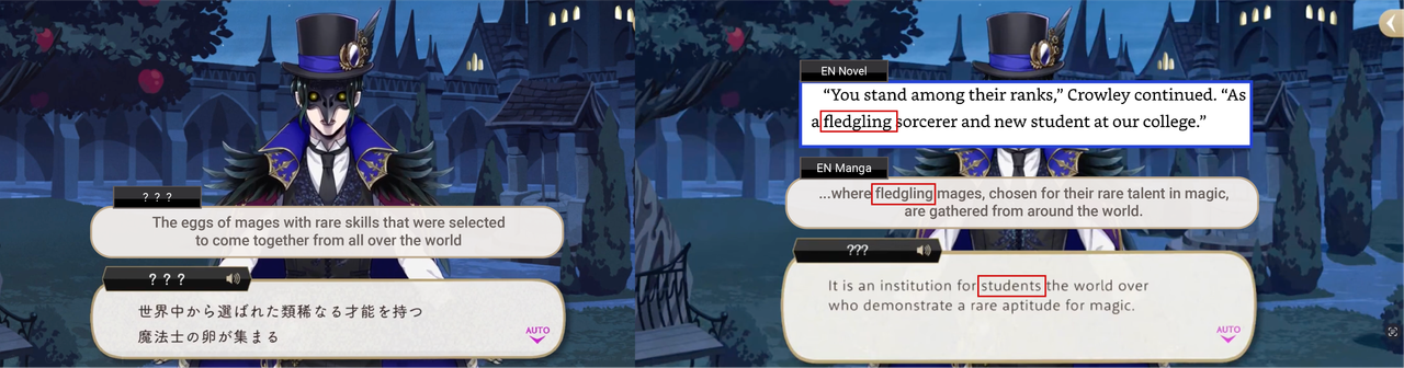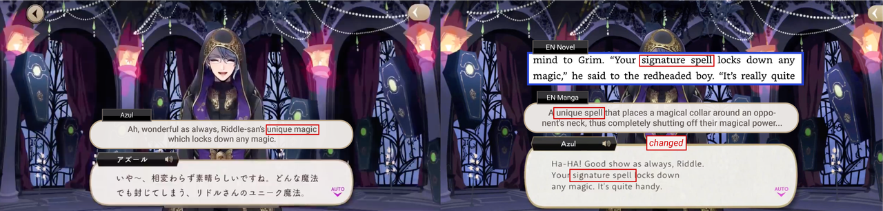A comparison of the official English translation of volume 1 of the Twst manga vs. the original manga (vs. the original game vs. EN server)