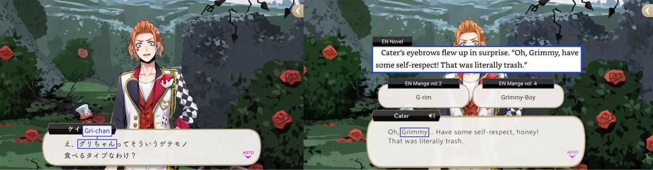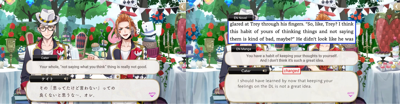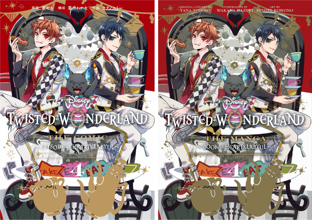 A comparison of the official English translation of volume 4 of the Twisted Wonderland manga vs. the original manga (vs. the original game vs. EN server vs. Original novel vs. EN novel)