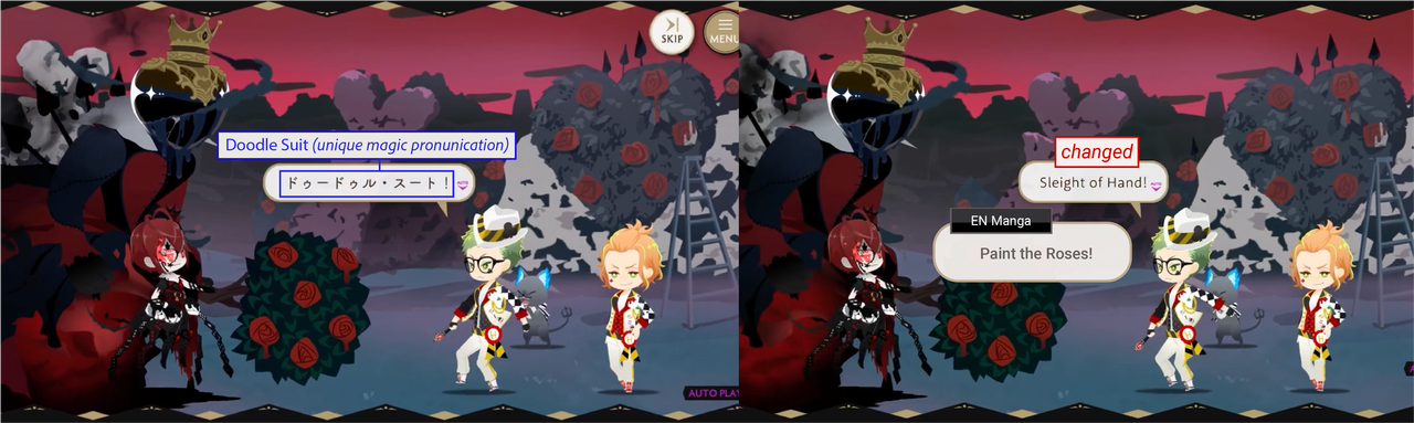 (In this same scene in the EN game Trey’s Doodle Suit/Paint the Roses was localized under yet another name (“Sleight of Hand”) for reasons unknown.)