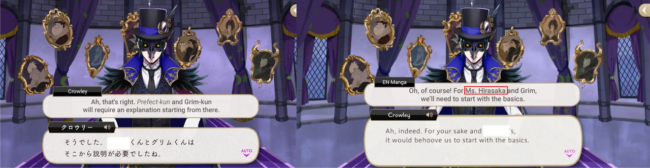 This is also true of Hirasaka Yuuka, the prefect of the Savanaclaw arc, who is also called “Yu” in all English-language panels in all EN manga except one, where Crowley refers to her as “Ms. Hirasaka” just once in the EN manga.