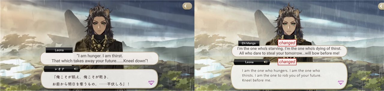 Original Game/Manga Leona: I am hunger. I am thirst. That which takes away your future……Kneel down!
