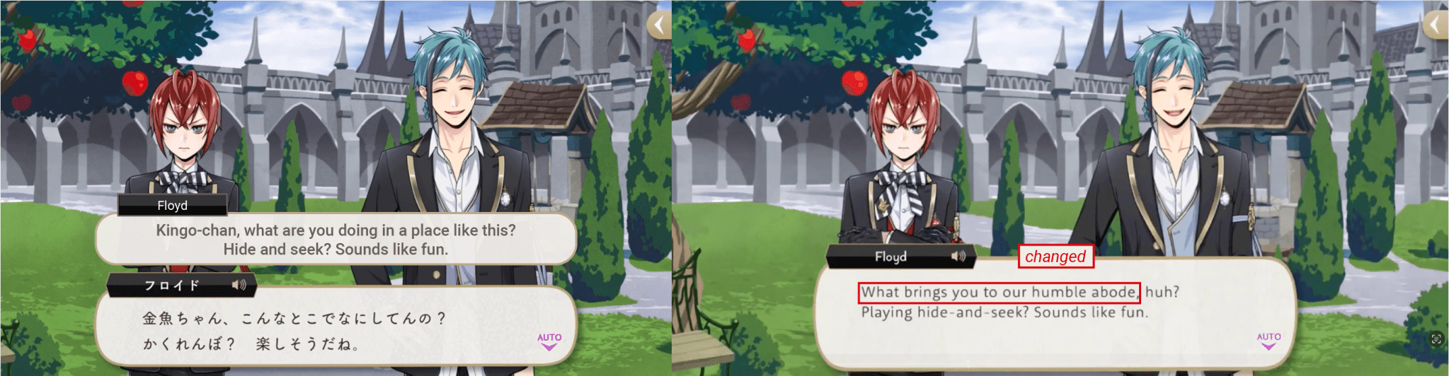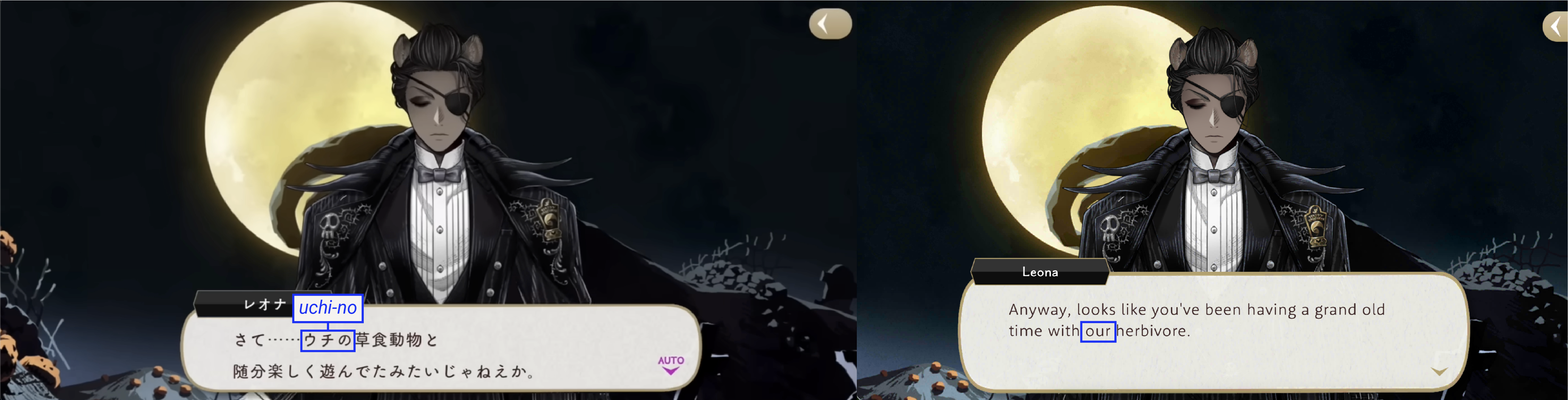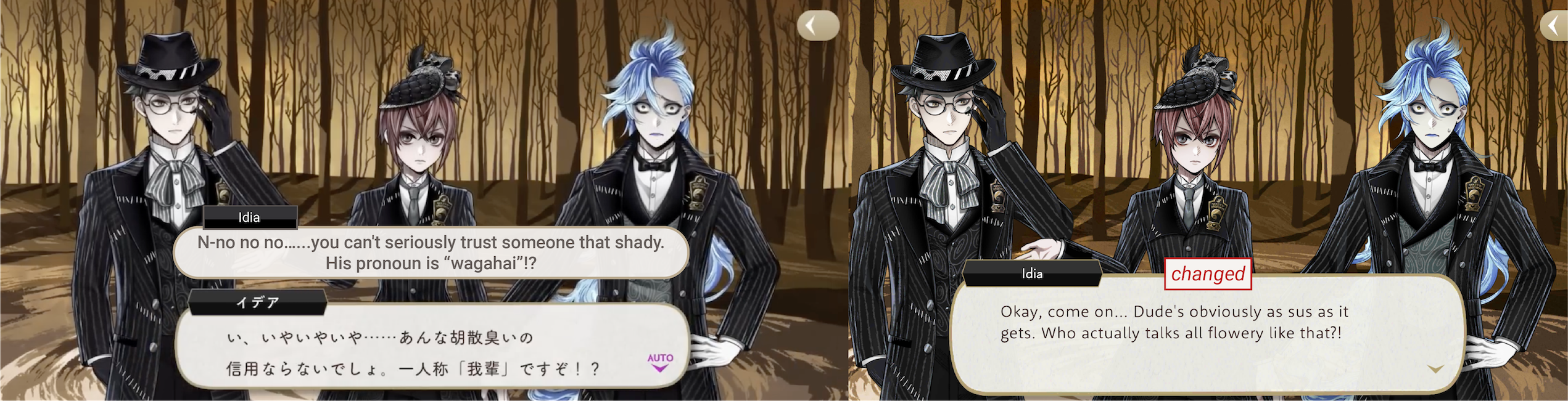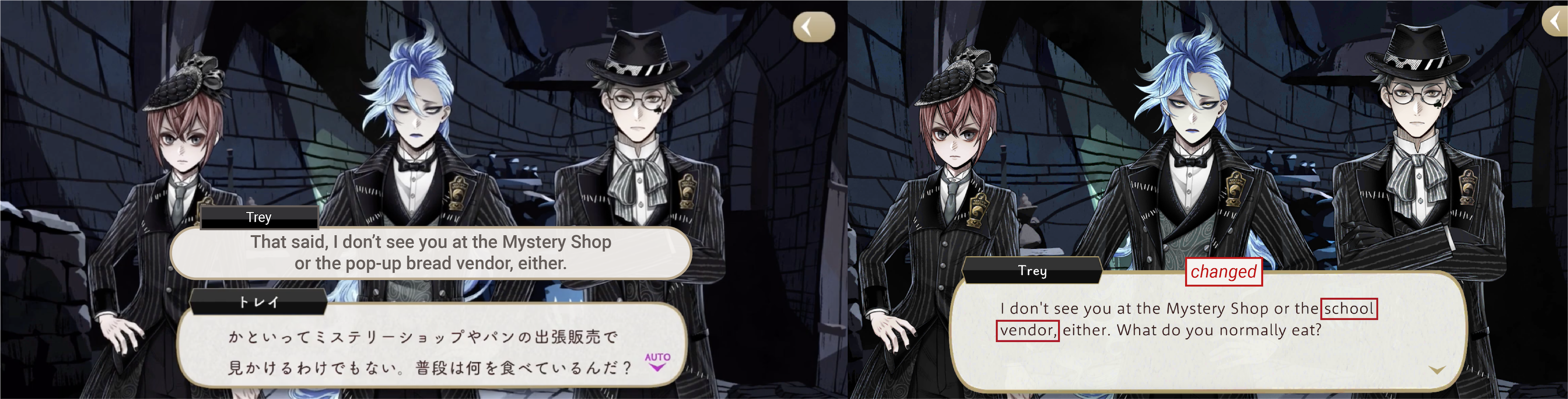 Idia comments on not being able to trust Skully because of his use of a strange personal pronoun (“wagahai”). Azul counters by pointing out that the pronoun that Idia uses a lot of the time, “sessha,” is equally odd. Changed on EN to Skully talking “flowery” and Azul countering with Idia’s “cryptic net slang.”